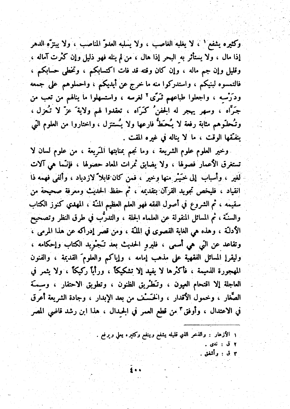 وخير العلوم علوم الشريعة، وما نجم بمنابتها المريعة، من علوم لسان لا تستغرق الأعمار فصولها، ولا يضايق ثمرات المعاد حصولها، فإنّما هي آلات لغير، وأسباب إلى خير منها وخير، فمن كان قابلاً لازدياد، وألفى فهمه ذا انقياد، فليخص تجويد القرآن بتقديمه، ثم حفظ الحديث ومعرفة صحيحه من سقيمه، ثم الشروع في أصول الفقه فهو العلم العظيم المنّة، المهدي كنوز الكتاب والسنّة، ثم المسائل المنقولة عن العلماء الجلة، والتدرّب في طرق النظر وتصحيح الأدلّة، وهذه هي الغاية القصوى في الملّة، ومن قصر إدراكه عن هذا المرمى، وتقاعد عن التي هي أسمى، فليرو الحديث بعد تجويد الكتاب وإحكامه، وليقرإ المسائل الفقهية على مذهب إمامه، وإياكم والعلوم القديمة، والفنون المهجورة الذميمة، فأكثرها لا يفيد إلا تشكيكاً، ورأياً ركيكاً، ولا يثمر في العاجلة إلا اقتحام العيون، وتطريق الظنون، وتطويق الاحتقار، وسمة الصّغار، وخمول الأقدار، والخسف من بعد الإبدار، وجادة الشريعة أعرق في الاعتدال، وأوفق (3) من قطع العمر في الجدال، هذا ابن رشد