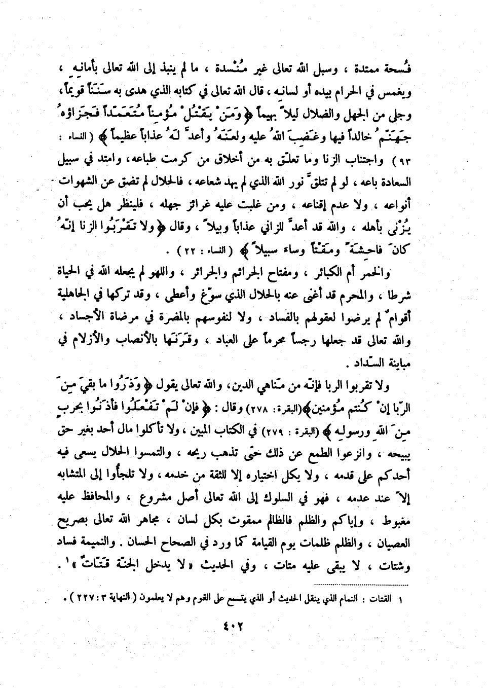 ولا تقربوا الربا فإنّه من مناهي الدين، والله تعالى يقول " وذروا ما بقي من الرّبا إن كنتم مؤمنين " البقرة: 278 وقال: " فإن لم تفعلوا فأذنوا بحرب من الله ورسوله " البقرة: 279 في الكتاب المبين، ولا تأكلوا مال أحد بغير حق يبيحه، وانزعوا الطمع عن ذلك حتى تذهب ريحه، والتمسوا الحلال يسعى فيه أحدكم على قدمه، ولا يكل اختياره إلا للثقة من خدمه، ولا تلجأوا إلى المتشابه إلاّ عند عدمه، فهو في السلوك إلى الله تعالى أصل مشروع، والمحافظ عليه مغبوط، وإياكم والظلم فالظالم ممقوت بكل لسان، مجاهر الله تعالى بصريح العصيان، والظلم ظلمات يوم القيامة كما ورد في الصحاح الحسان. والنميمة فساد وشتات، لا يبقى عليه متات، وفي الحديث " لا يدخل الجنّة قتّات " (1) .
