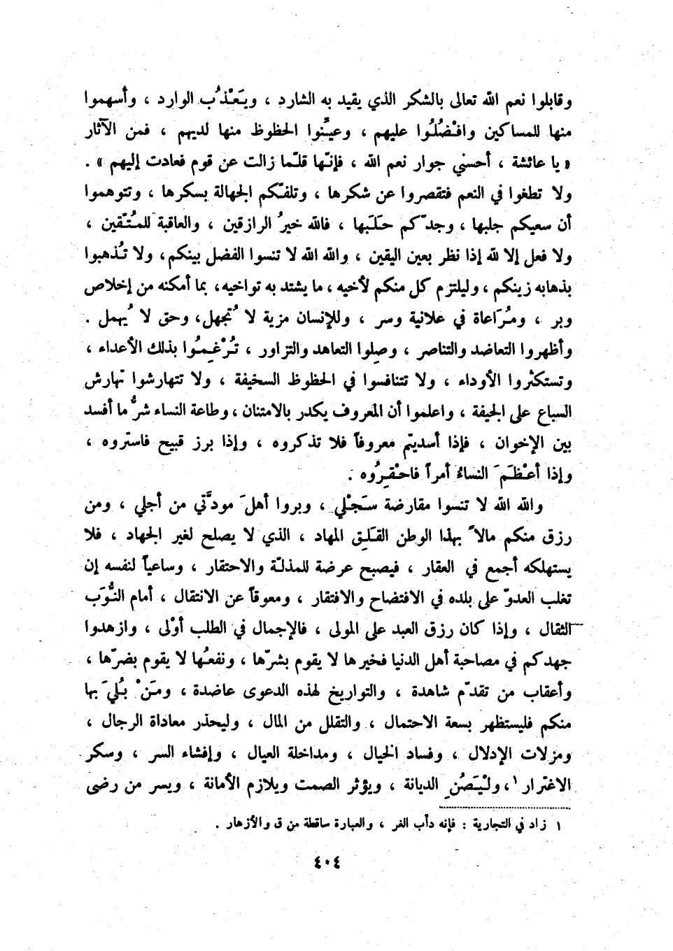 وقابلوا نعم الله تعالى بالشكر الذي يقيد به الشارد، ويعذب الوارد، وأسهموا منها للمساكين وافضلوا عليهم، وعيّنوا الحظوظ منها لديهم، فمن الآثار " يا عائشة، أحسني جوار نعم الله، فإنّها قلّما زالت عن قوم فعادت إليهم ". ولا تطغوا في النعم فتقصروا عن شكرها، وتلفّكم الجهالة بسكرها، وتتوهموا أن سعيكم جلبها، وجدّكم حلبها، فالله خير الرازقين، والعاقبة للمتّقين، ولا فعل إلا لله إذا نظر بعين اليقين، والله الله لا تنسوا الفضل بينكم، ولا تذهبوا بذهابه زينكم، وليلتزم كل منكم لأخيه، ما يشتد به تواخيه، بما أمكنه من إخلاص وبر، ومراعاة في علانية وسر، وللإنسان مزية لا تجهل، وحق لا يهمل. وأظهروا التعاضد والتناصر، وصلوا التعاهد والتزاور، ترغموا بذلك الأعداء، وتستكثروا الأوداء، ولا تتنافسوا في الحظوظ السخيفة، ولا تتهارشوا تهارش السباع على الجيفة، واعلموا أن المعروف يكدر بالامتنان، وطاعة النساء شرّ ما أفسد بين الإخوان، فإذا أسديتم معروفاً فلا تذكروه، وإذا برز قبيح فاستروه، وإذا أعظم النساء أمراً فاحقروه.