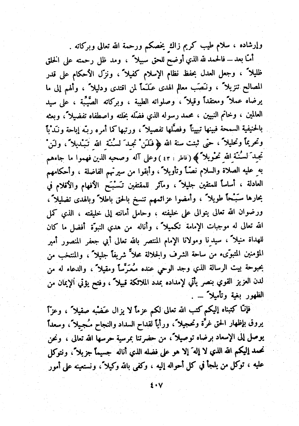 أمّا بعد - فالحمد لله الذي أوضح للحق سبيلاً، ومد ظل رحمته على الخلق ظليلاً، وجعل العدل بحفظ نظام الإسلام كفيلاً، ونزّل الأحكام على قدر المصالح تنزيلاً، ونصب معالم الهدى علماً لمن اقتدى ودليلاً، وألهم إلىما يرضاه عملاً ومعتقداً وقيلاً، وصلواته الطيبة، وبركاته الصّيّبة، على سيد العالمين، وخاتم النبيين، محمد رسوله الذي فضّله بخلته واصطفاه تفضيلاً، وبعثه بالحنيفية السمحة فبينها تبييناً وفصّلها تفصيلاً، ورتبها كما أمره ربّه إباحة وندباً وتحريماً وتحليلاً، حتى ثبتت سنة الله " فلن تجد لسنّة الله تبديلاً، ولن تجد لسنّة الله تحويلاً " (فاطر: 43) وعلى آله وصحبه الذين فهموا ما جاءهم به عليه الصلاة والسلام نصّاً وتأويلاً، وأبقوا من سيرتهم الفاضلة، وأحكامهم العادلة، أساساً للمتقين جليلاً، ومآثر للمقتفين تسبح الأفهام والأقلام في بحارها سبحاً طويلاً، وأمضوا عزائمهم تنسخ بالحق باطلاً وبالهدى تضليلاً، ورضوان الله تعالى يتوالى على خليفته، وحامل أمانته إلى خليقته، الذي كمل الله تعالى له موجبات الإمامة تكميلاً، وأناله من هدي النبوّة أفضل ما كان للهداة منيلاً، سيدنا ومولانا الإمام المنتصر بالله تعالى أبي جعفر المنصور أمير المؤمنين المتبوّىء من ساحة الشرف والجلالة محلاً شريفاً جليلاً، والمنتخب من بحبوحة بيت الرسالة الذي وجد الوحي عنده معرّساً ومقيلاً، والدعاء له من لدن العزيز القوي بنصر يأتي لإمداده بمدد الملائكة قبيلاً، وفتح يؤتي الإيمان من الظهور بغية وتأميلاً -.
