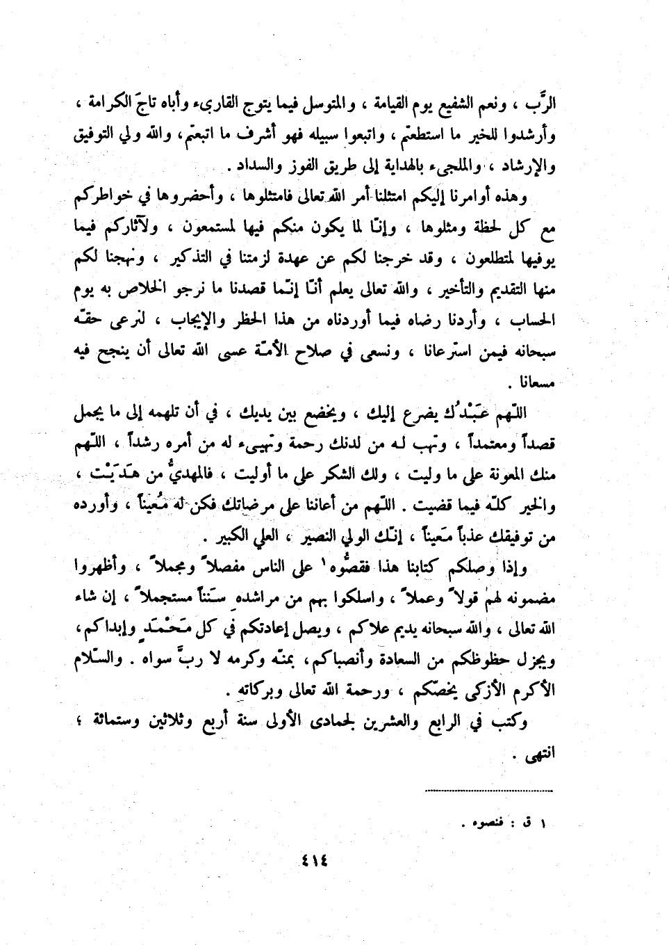 وإذا وصلكم كتابنا هذا فقصّوه (1) على الناس مفصلاً ومجملاً، وأظهروا مضمونه لهم قولاً وعملاً، واسلكوا بهم من مراشده سنناً مستجملاً، إن شاء الله تعالى، والله سبحانه يديم علاكم، ويصل إادتكم في كل محمد وإبداكم، ويجزل حظوظكم من السعادة وأنصباكم، بمنّه وكرمه لا ربّ سواه. والسّلام الأكرم الأزكى يخصّكم، ورحمة الله تعالى وبركاته.