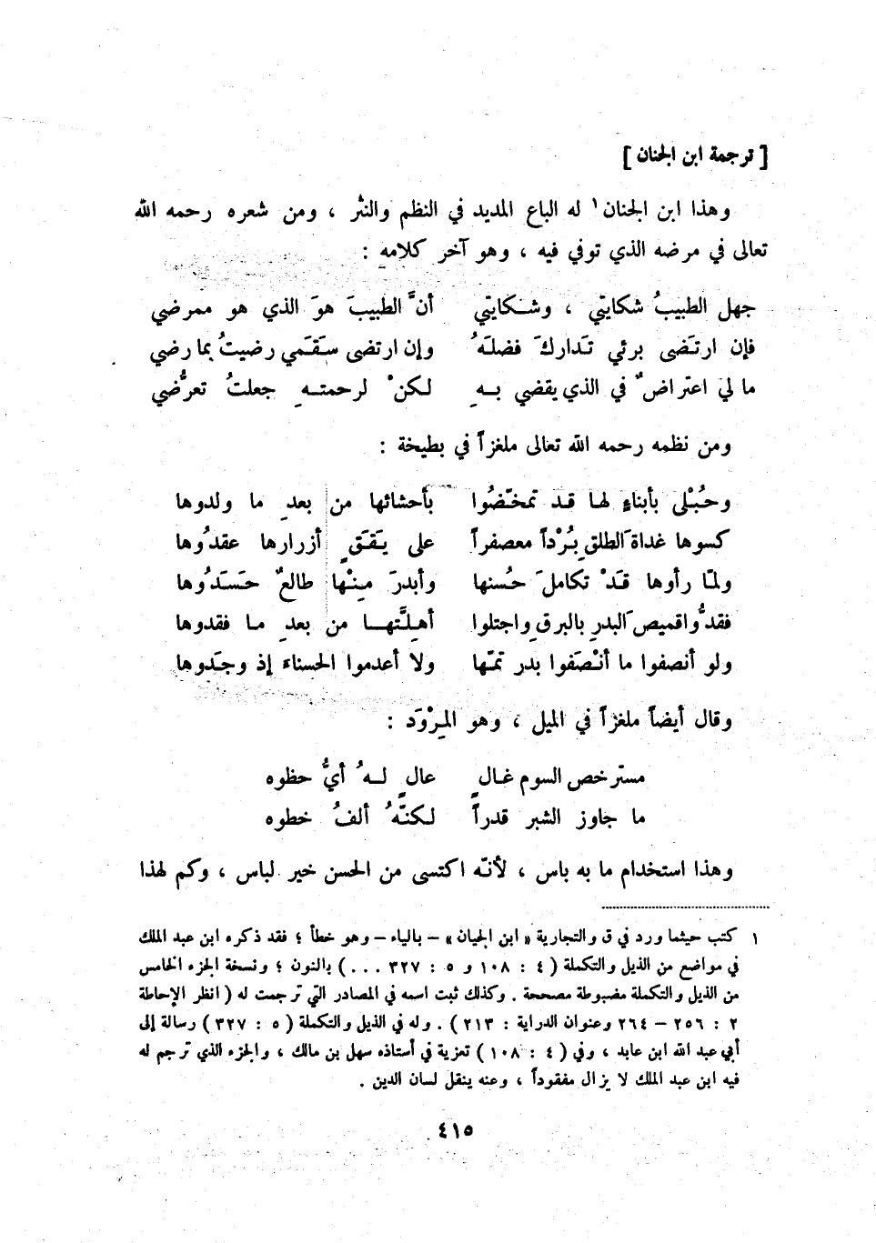 وهذا ابن الجنان (1) له الباع المديد في النظم والنثر، ومن شعره رحمه الله تعالى في مرضه الذي توفي فيه، وهو آخر كلامه:
