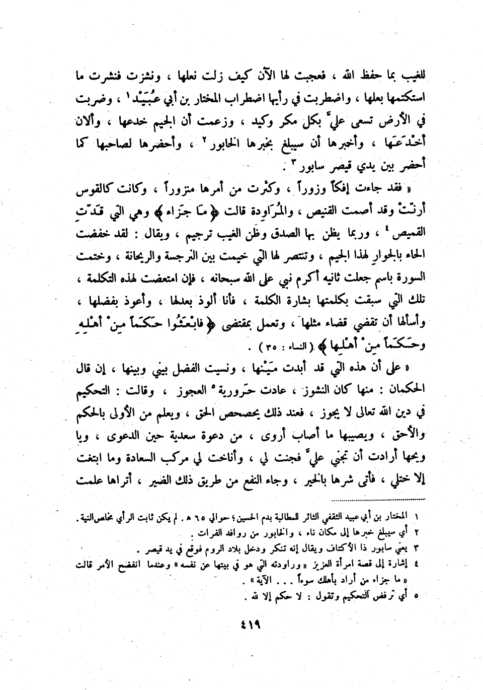 للغيب بما حفظ هـ، فعجبت لها الآن كيف زلت نعلها، ونشزت فنسرت ما استكتمها بعلها، واضطربت في رأيها اضطراب المختار بين أبي عبيد (1) ، وضربت في الأرض تسعى عليّ بكل مكر وكيد، وزعمت أن الجيم خدعها، وألان أخدعها، وأخبرها أن سيبلغ بخبرها الخابور (2) ، وأحضرها لصاحبها كما أحضر بين يدي قيصر سابور (3) .