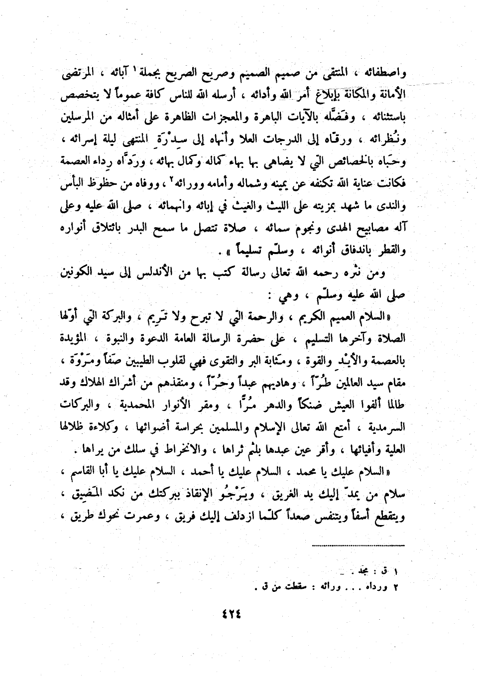 السلام العميم الكريم، والرحمة التي لا تبرح ولا تريم، والبركة التي أوّلها الصلاة وآخرها التسليم، على حضرة الرسالة العامة الدعوة والنبوة، المؤيدة بالعصمة والأيد والقوة، ومثابة البر والتقوى فهي لقلوب الطيبين صفاً ومروة، مقام سيد العالمين طرّاً، وهاديهم عبداً وحرّاً، ومنقذهم من أشراك الهلاك وقد طالما ألفوا العيش ضنكاً والدهر مرّاً، ومقر الأنوار المحمدية، والبركات السرمدية، أمتع الله تعالى الإسلام والمسلمين بحراسة أضوائها، وكلاءة ظلالها العلية وأفيائها، وأقر عين عبدها بلثم ثراها، والانخراط في سلك من يراها.