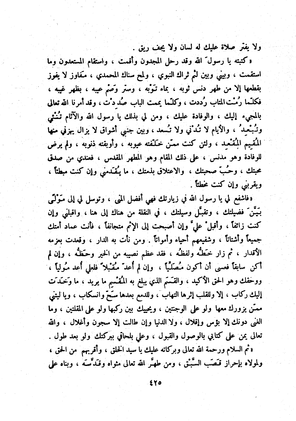 " فاشفع لي يا رسول الله في زيارتك فهي أفضل المنى، وتوسل لي إلى مولىً بيّن فضيلتك، وتقبّل وسيلتك، في النقلة من هناك إلى هنا، واقبلني وإن كنت زائفاً، وأقبل عليّ وإن أصبحت إلى الإثم متجانفاً، فأنت عماد أمتك جميعاً وأشتاتاً، وشفيعهم أحياء وأمواتاً. ومن نأت به الدار، وقعدت بعزمه الأقدار، ثم زار خطّه ولفظه، فقد عظم نصيبه من الخير وحظّه، وإن لم أكن سابقاً فعسى أن أكون مصلّياً، وإن لم أعدّ مقبلاً فلعلي أعد مولياً، ووحقك وهو الحق الأكيد، والقسم الذي يبلغ به المقسم ما يريد، ما وخدت إليك ركاب، إلا وللقلب إثرها التهاب، وللدمع بعدها سحّ وانسكاب، ويا ليتني ممّن يزورك معها ولو على الوجننتين، ويحييك بين ركبها ولو على المقلتين، وما الغنى دونك إلا بؤس وإقلال، ولا الدنيا وإن طالت إلا سجون وأغلال، والله تعالى يمن على كتابي بالوصول والقبول، وعلي بلحاقي ببركتك ولو بعد طول.