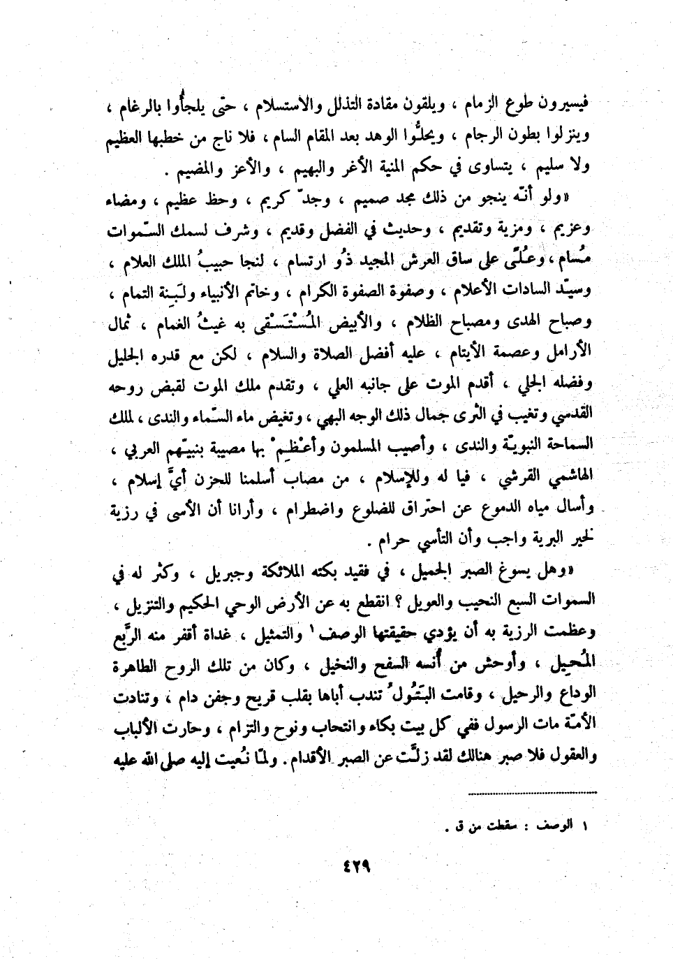 ولو أنّه ينجو من ذلك مجد صميم، وجدّ كريم، وحظ عظيم، ومضاء وعزيم، ومزية وتقديم، وحديث في الفضل وقديم، وشرف لسمك السّموات مُسام، وعلىً على ساق العرش المجيد ذو ارتسام، لنجا حبيب الملك العلام، وسيّد السادات الأعلام، وصفوة الصفوة الكرام، وخاتم الأنبياء ولبنة التمام، وصباح الهدى ومصباح الظلام، والأبيض المستسقى به غيث الغمام، ثمال الأرامل وعصمة الأيتام، عليه أفضل الصلاة والسلام، لكن مع قدره الجليل وفضله الجلي، أقدم الموت على جانبه العلي، وتقدم ملك الموت لقبض روحه القدسي وتغيب في الثرى جمال ذلك الوجه البهي، وتغيض ماء السّماء والندى، لملك السماحة النبويّة والندى، وأصيب المسلمون وأعظم بها مصيبة بنبيّهم العربي، الهاشمي القرشي، فيا له وللإسلام، من مصاب أسلمنا للحزن أيّ إسلام، وأسال مياه الدموع عن احتراق للضلوع واضطرام، وأرانا أن الأسى في رزية لخير البرية واجب وأن التأسي حرام.