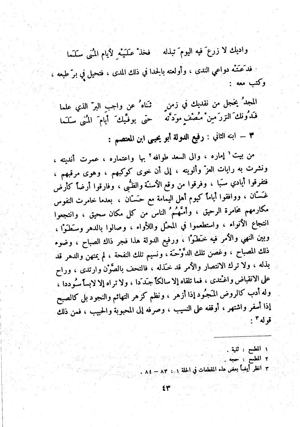 من بيت (1) إماره، وإلى السعد طوافه (2) بها واعتماره، عمرت أنديته، ونشرت به رايات العزّ وألويته، إلى أن خوى كوكبهم، وهوى مرقبهم، فتفرقوا أيادي سبا، وفرقوا من وقع الأسنّة والظّبي، وفارقوا أرضاً كأرض غسّان، ووافقوا أياماً كيوم أهل اليمامة مع حسّان، بعدما خامرت النفوس مكارمهم مخامرة الرحيق، وأمّهم الناس من كل مكان سحيق، وانتجعوا انتجاع الأنواء، واستطعموا في المحل واللأواء، وصالوا بالدهر وسطوا، وبين النهي والأمر فيه خطوا، ورفيع الدولة هذا فجر ذاك الصباح، وضوء ذلك المصباح، وغصن تلك الدوّحة، ونسيم تلك النفخة، لم يمتهن والدهر قد بذله، ولا ترك الانتصار والأمر قد خذله، فالتحف بالصّون وارتدى، وراح على الانقباض واغتدى، فما تلقاه إلا سالكاً جددا، ولا تراه إلا لابساً سوددا، وله أدب كالروض المجود إذا أزهر، ونظم كزهرالتهائم والنجود بل كالصبح إذا أسفر واشتهر، أوقفه على النسيب، وصرفه إلى المحبوبة والحبيب، فمن ذلك قوله (3) :