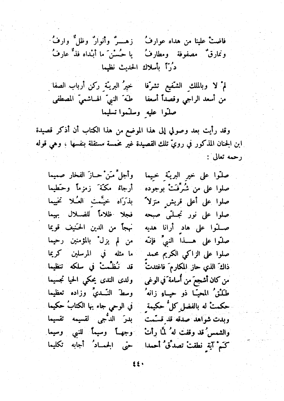 من أسعد الراجي وقصداً أسعفا ... طه النبيّ الهاشمي المصطفى صلّوا عليه وسلّموا تسليما ... وقد رأيت بعد وصولي إلى هذا الموضع من هذا الكتاب أن أذكر قصدية ابن الجنان المذكور في رويّ تلك القصيدة غير مخمسة مستقلة بنفسها، وهي قوله رحمه تعالى:
