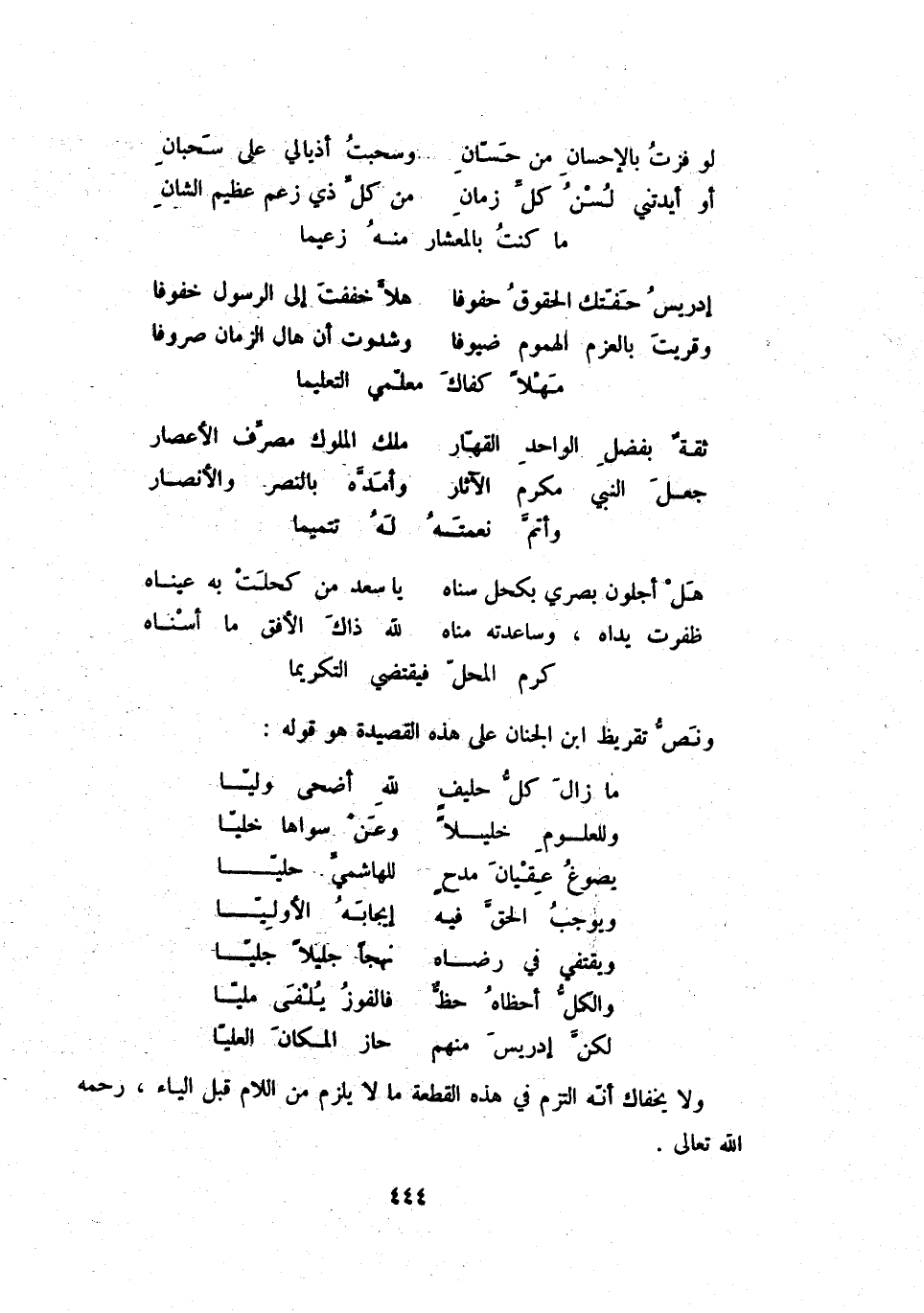 ظفرت يداه، وساعدته مناه ... لله ذاك الأفق ما أسناه كرم المحلّ فيقتضي التكريما ... ونصّ تقريظ ابن الجنان على هذه القصيدة هو قوله: