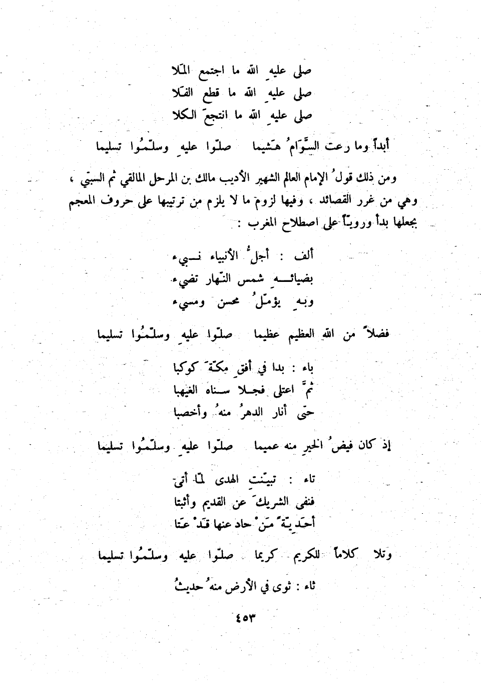 أبداً وما رعت السّوام هشيما ... صلّوا عليه وسلّموا تسليما ومن ذلك قول الإمام العالم الشهير الأديب مالك بن المرحل المالقي ثم السبتي، وهي من غرر القصائد، وفيها لزوم ما لا يلزم من ترتيبها على حروف المعجم يجعلها بدأ ورويّاً على اصطلاح المغرب: