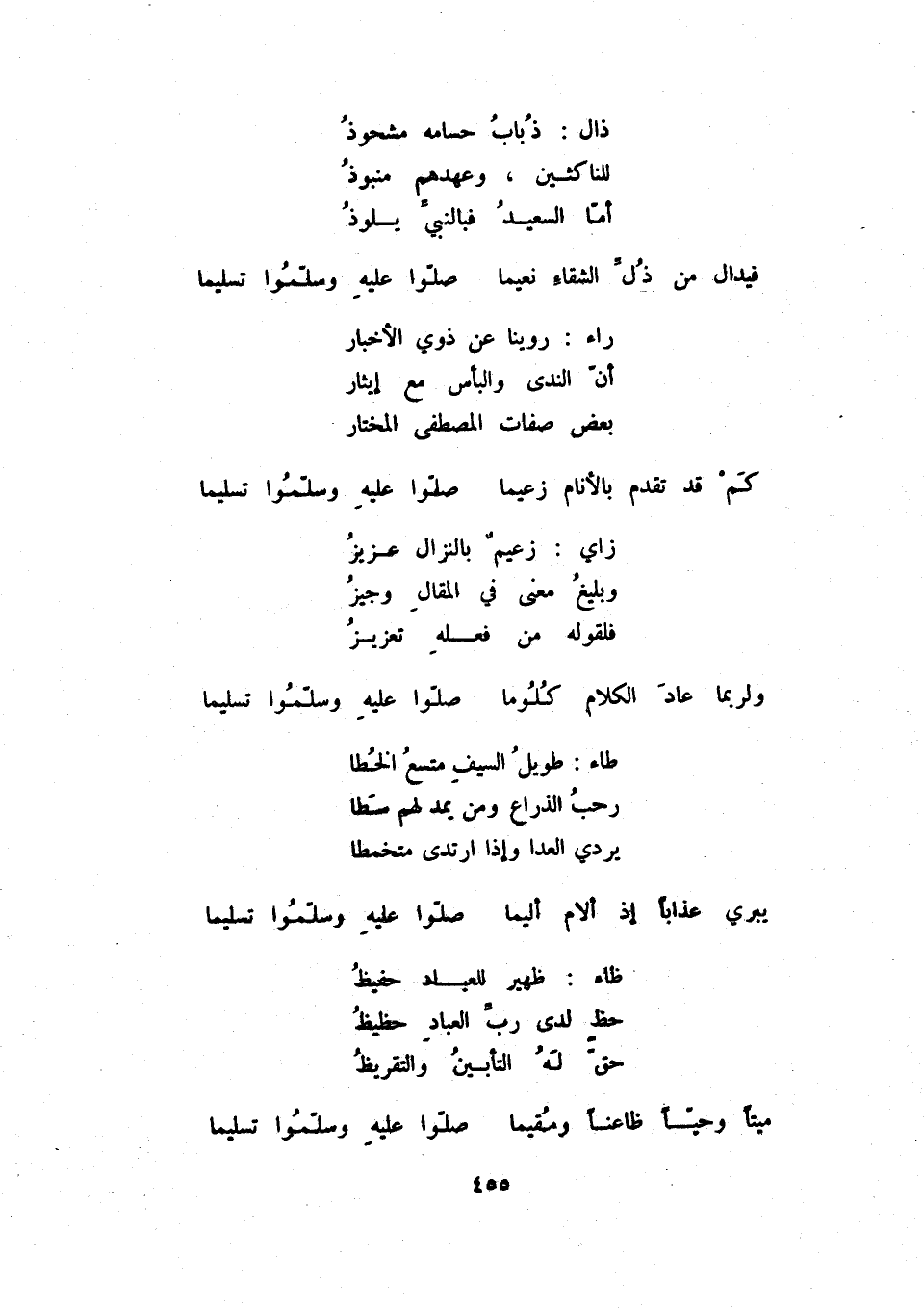 فيدال من ذلّ الشقاء نعيما ... صلّوا عليه وسلّموا تسليما راء: روينا عن ذوي الأخبار ... أنّ الندى والبأس مع إيثار ... بعض صفات المصطفى المختار ...