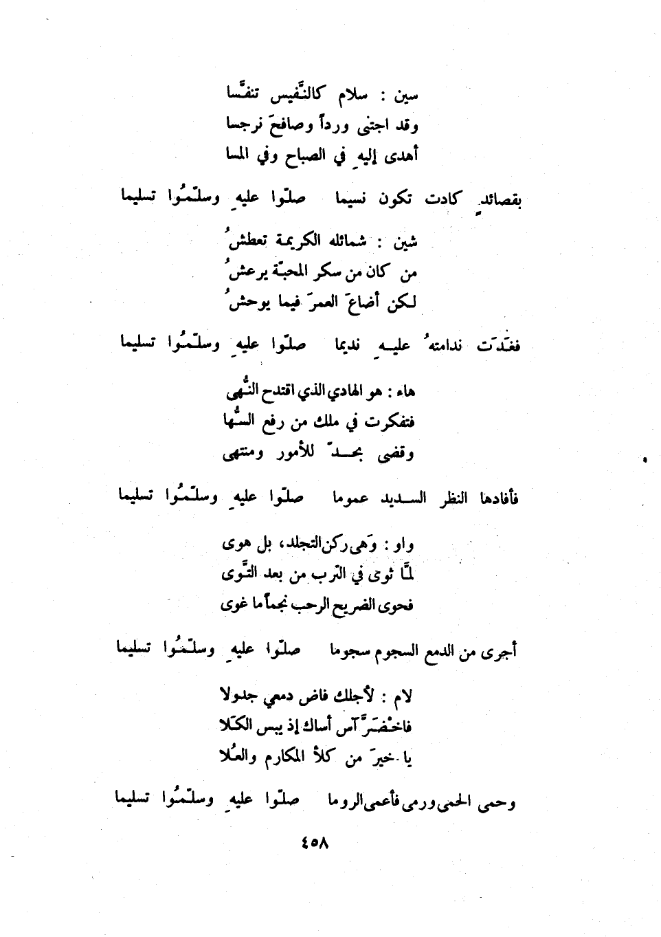 بقصائد كادت تكون نسيما ... صلّوا عليه وسلّموا تسليما شين: شمائله الكريمة تعطش ... من كان من سكر المحبّة يرعش ... لكن أضاع العمر فيما يوحش ...