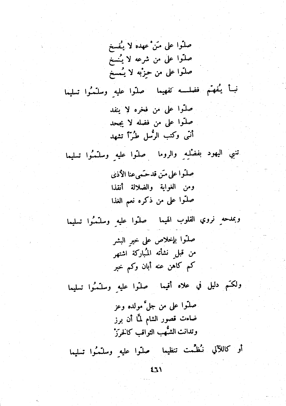 تنبي اليهود بفضله والروما ... صلّوا عليه وسلّموا تسليما صلّوا على من قد حمى عنا الأذى ... ومن الغواية والضلالة أنقذا ... صلّوا على من ذكره نعم الغذا ...