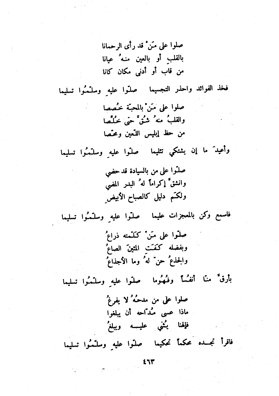 فخذ الفوائد واحذر التجسيما ... صلّوا عليه وسلّموا تسليما صلوا على من بالمحبّة خصصا ... والقلب منه شقّ حتى خلّصا ... من حظ إبليس اللّعين ومحّصا ...