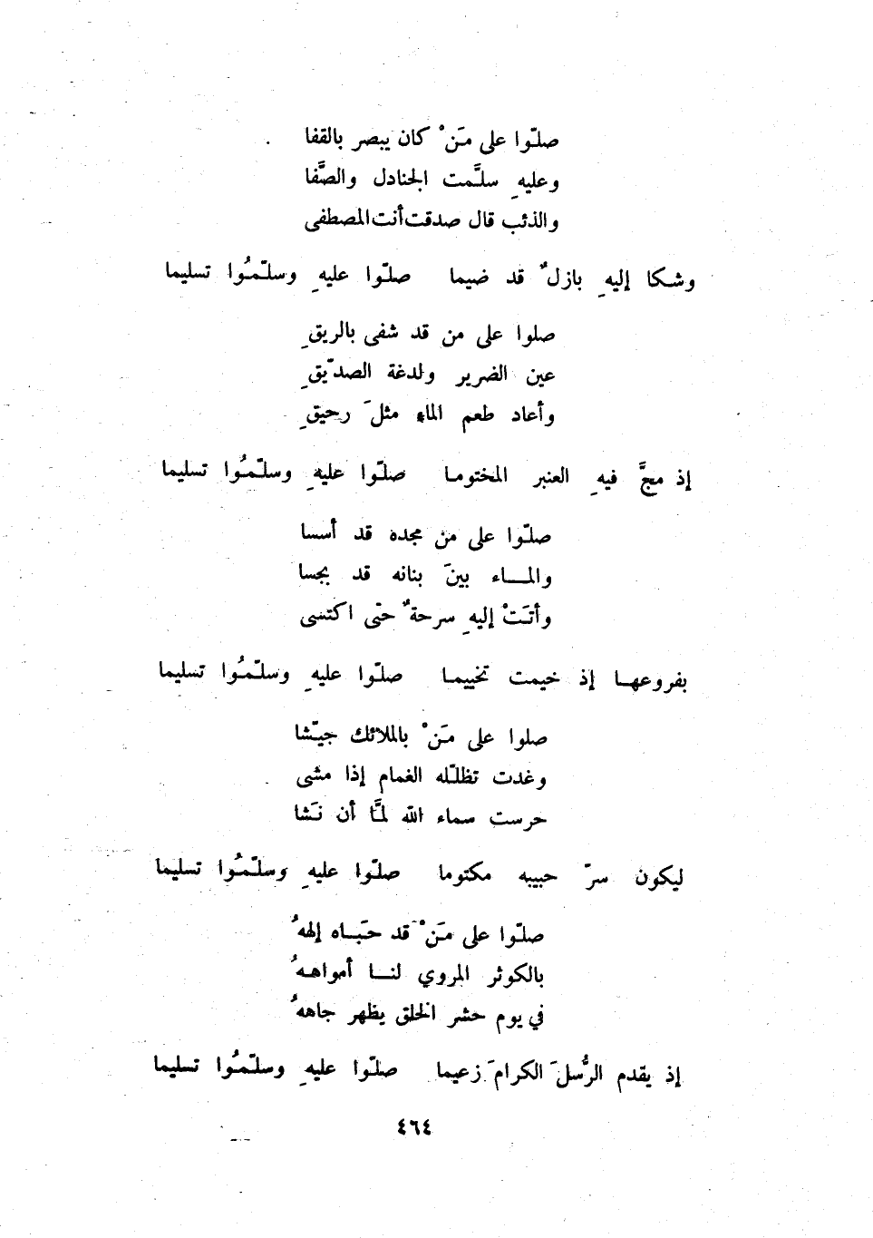 إذ مجّ فيه العنبر المختوما ... صلّوا عليه وسلّموا تسليما صلّوا على من مجده قد أسسا ... والماء بين بنانه قد بجسا ... وأتت إليه سرحة حتى اكتسى ...