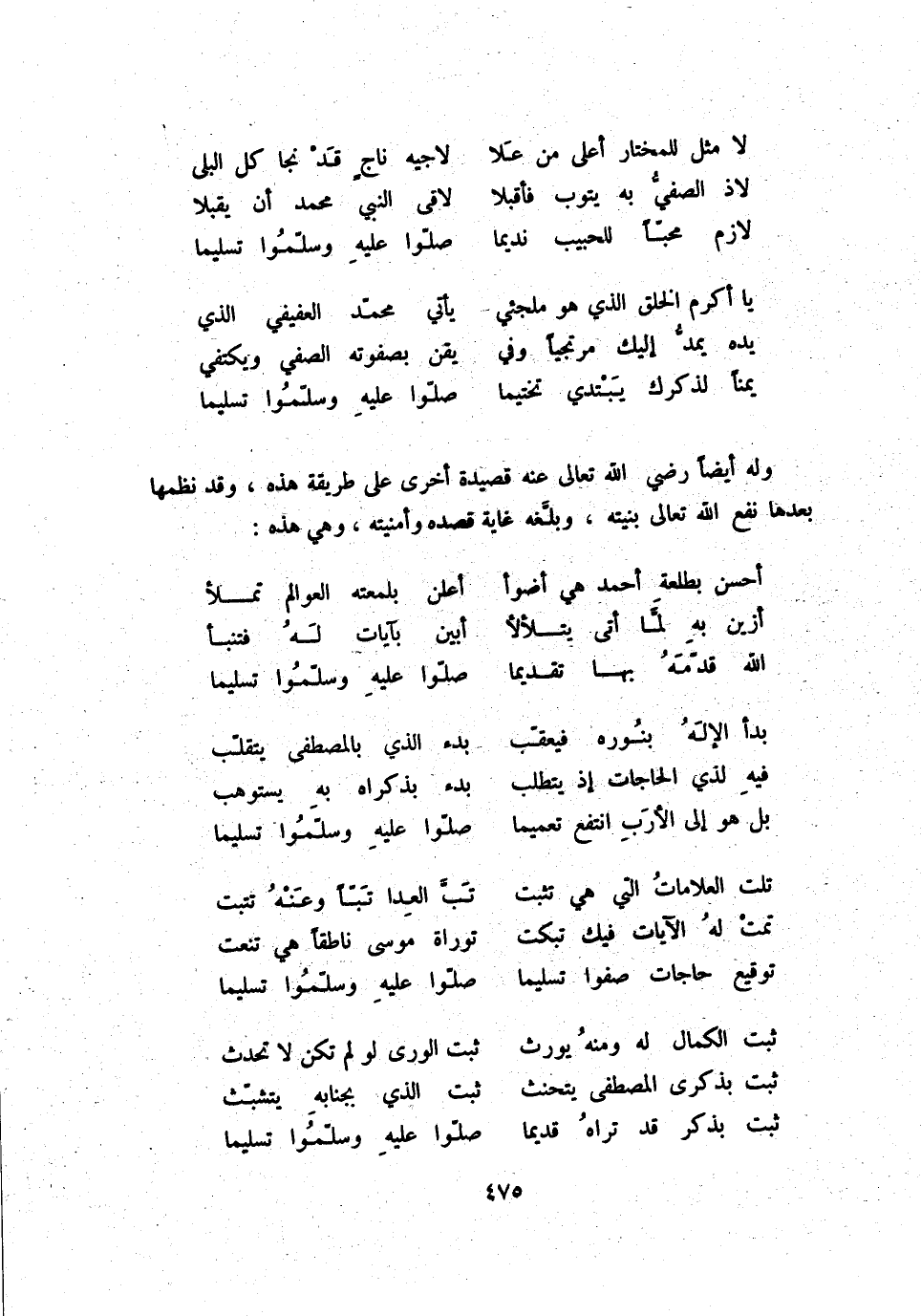 يمناً لذكرك يبتدي تختيما ... صلّوا عليه وسلّموا تسليما وله أيضاً رضي الله تعالى عنه قصيدة أخرى على طريقة هذه، وقد نظمها بعدها نفع الله تعالى بنيته، وبلّغه غاية قصده وأمنيته، وهي هذه: