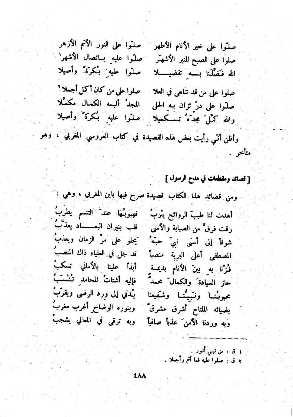 والله كمّل مجده تكميلا ... صلّوا عليه بكرةً وأصيلا وأظن أنّي رأيت بعض هذه القصيدة في كتاب العروسي المغربي، وهو متأخر.