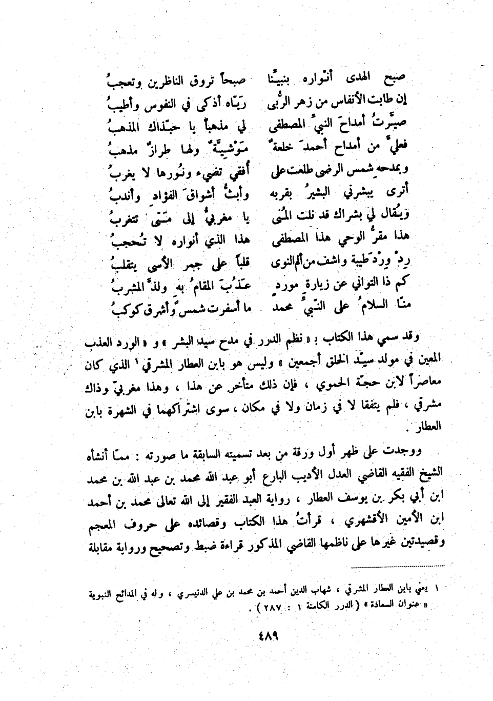 منّا السلام على النّبيّ محمد ... ما أسفرت شمس وأشرق كوكب وقد سمي هذا الكتاب " بنظم الدرر في مدح سيد البشر " والورد العذب المعين في مولد سيّد الخلق أجمعين وليس هو بابن العطار المشرقي (1) الذي كان معاصراً لابن حجّة الحموي، فإن ذلك متأخر عن هذا، وهذا مغربيّ وذاك مشرقي، فلم يتفقا لا في زمان ولا في مكان، سوى اشتراكهما في الشهرة بابن العطار.