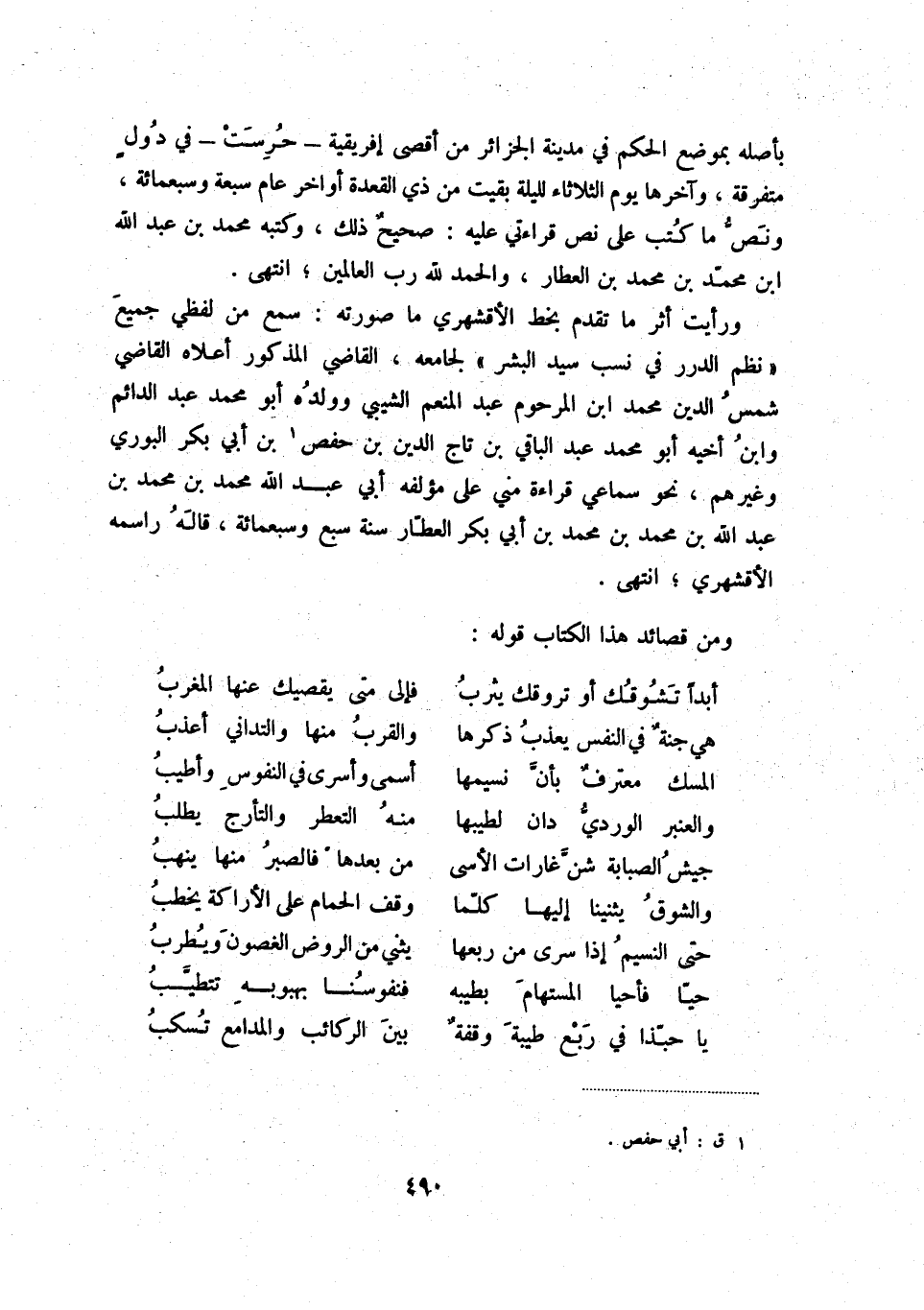 ورأيت أثر ما تقدم بخط الأقشهري ما صورته: سمع من لفظي جميع " نظم الدرر في نسب سيد البشر " لجامعه، القاضي المذكور أعلاه القاضي شمس الدين محمد ابن المرحوم عبد المنعم الشيبي وولده أبو محمد عبد الدائم وابن أخيه أبو محمد عبد الباقي بن تاج الدين بن حفص (1) بن أبي بكر البوري وغيرهم، نحو سماعي قراءة مني على مؤلفه أبي عبد الله محمد بن محمد بن عبد الله بن محمد بن محمد بن أبي بكر العطّار سنة سبع وسبعمائة، قاله راسمه الأقشهري؛ انتهى.