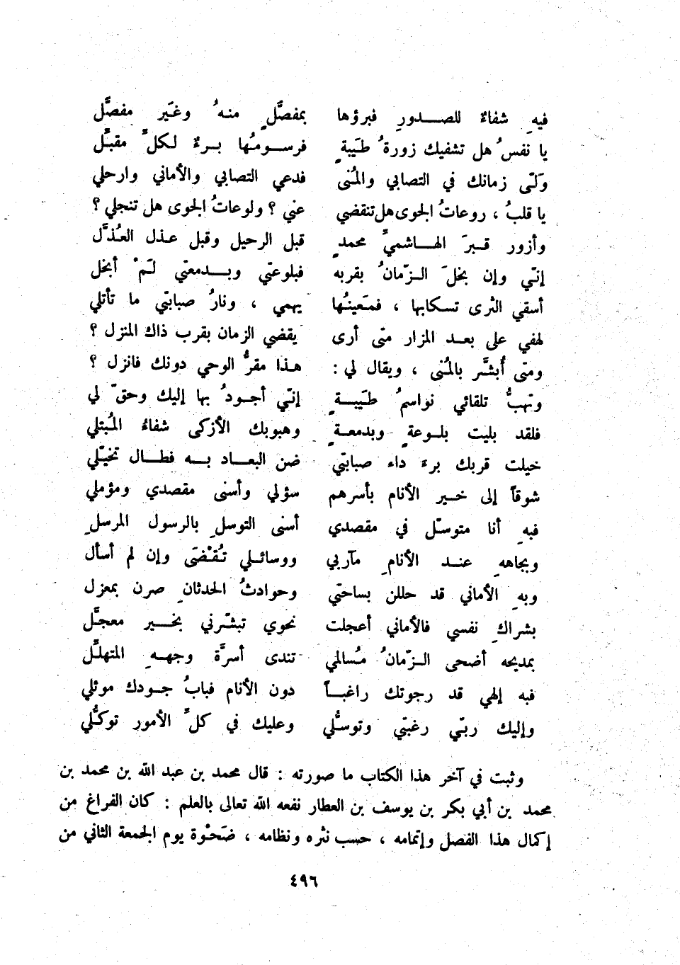 وإليك ربّي رغبتي وتوسّلي ... وعليك في كلّ الأمور توكّلي وثبت في آخر هذا الكتاب ما صورته: قال محمد بن عبد الله بن محمد بن محمد بن أبي بكر بن يوسف بن العطار نفعه الله تعالى بالعلم: كان الفرغ من إكمال هذا الفصل وإتمامه، حسب نثره ونظامه، ضحوة يوم الجمعة الثاني من