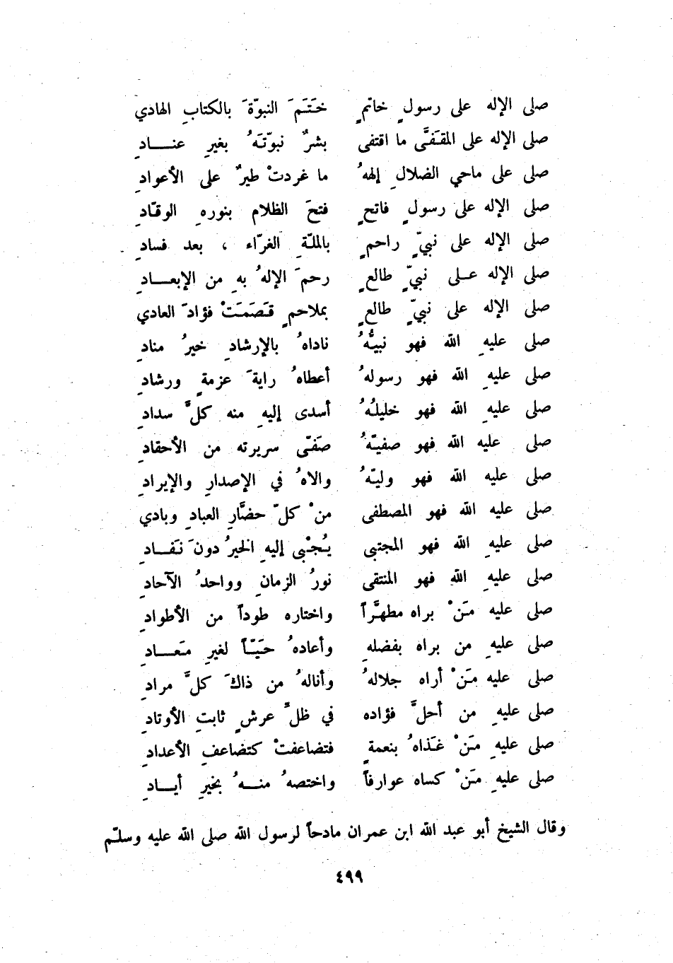 صلى عليه من كساه عوارفاً ... واختصه منه بخير أياد وقال الشيخ أبو عبد الله ابن عمران مادحاً لرسول الله صلى الله عليه وسلّم