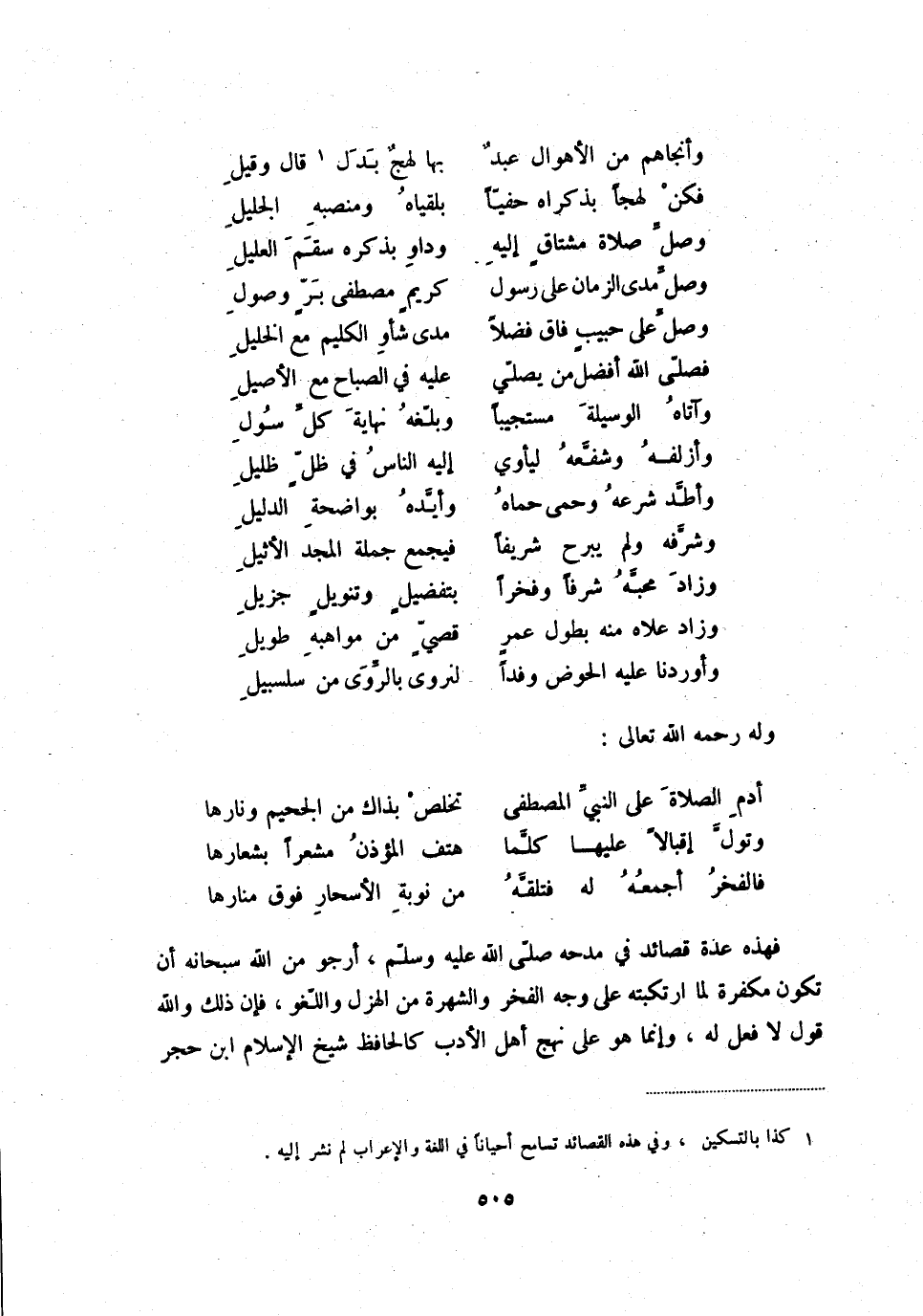 فالفخر أجمعه له فتلقّه ... من نوبة الأسحار فوق منارها فهذه عدة قصائد في مدحه صلى الله عليه وسلّم، أرجو من الله سبحانه أن تكون مكفرة لما ارتكبته على وجه الفخر والشهرة من الهزل واللّغو، فإن ذلك والله قول لا فعل له، وإنما هو على نهج أهل الأدب كالحافظ شيخ الإسلام ابن حجر