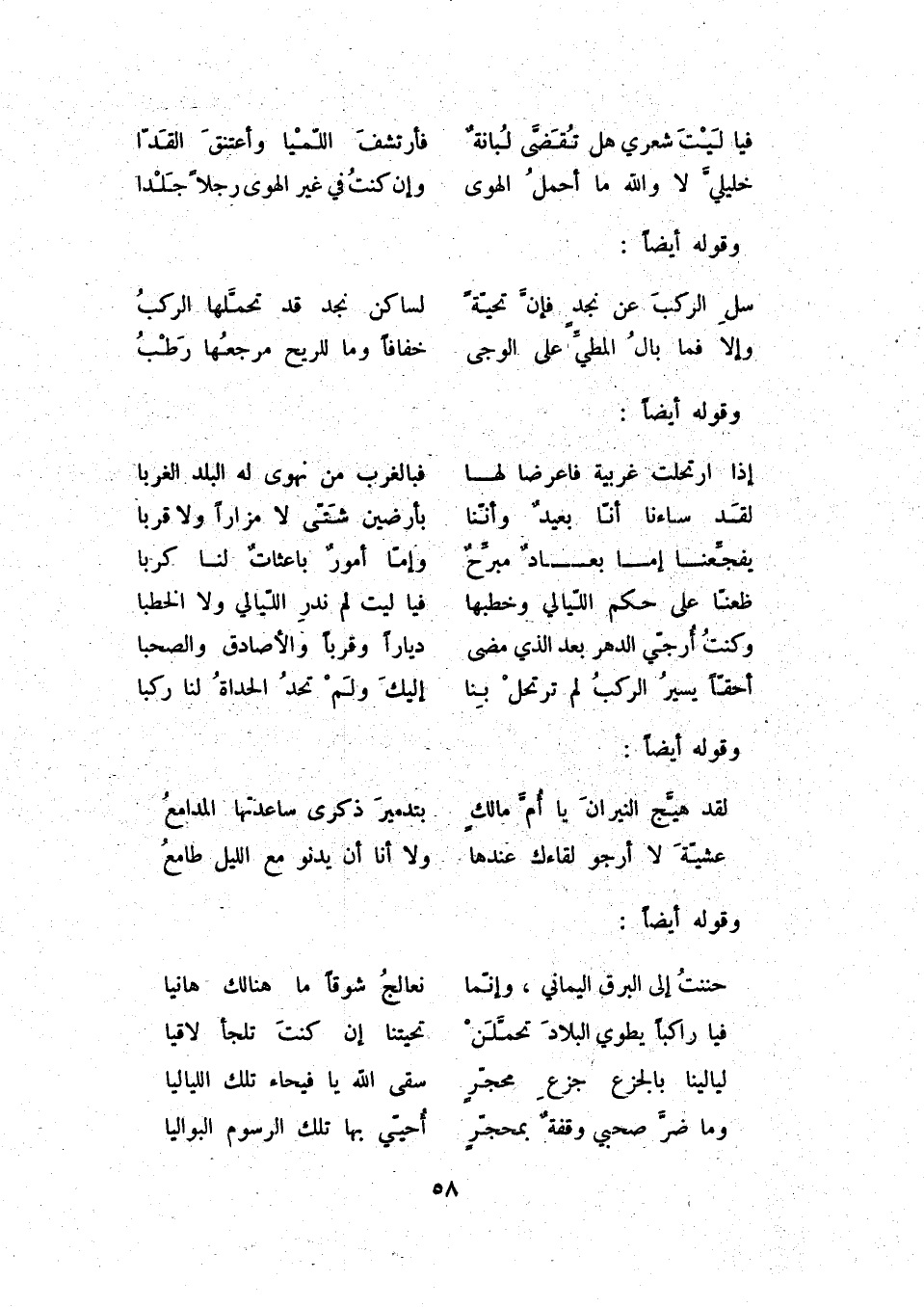 أحقّاً يسيرُ الركب لم ترتحل بنا ... إليك ولم تحد الحداة لنا ركبا وقوله أيضاً: