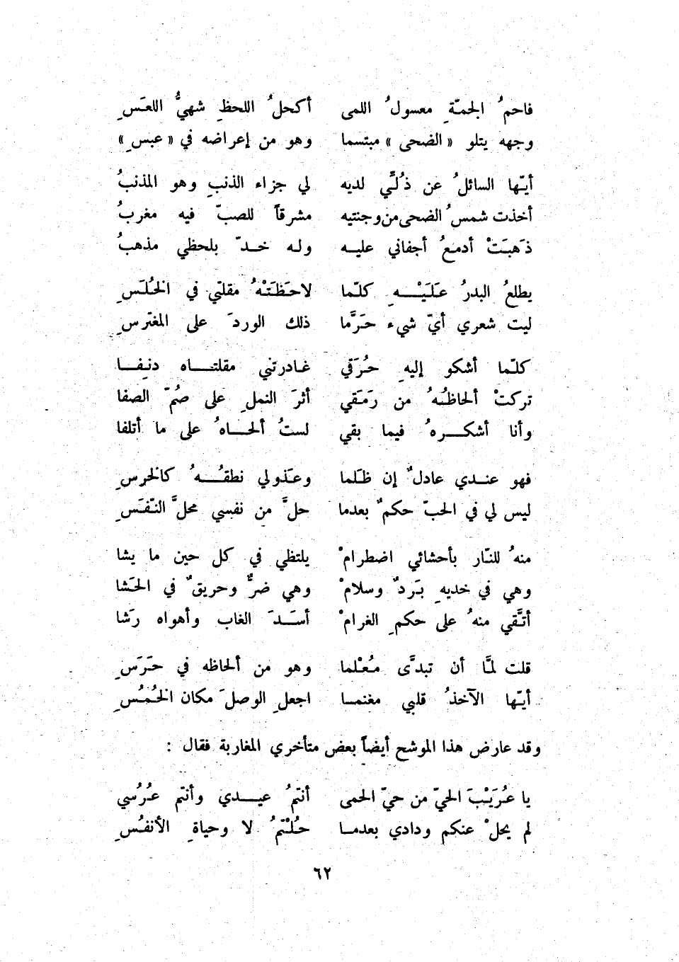 أيها الآخذ قلبي مغنما ... اجعل الوصل مكان الخمس وقد عارض هذا الموضح أيضاً بعض متأخري المغاربة فقال: