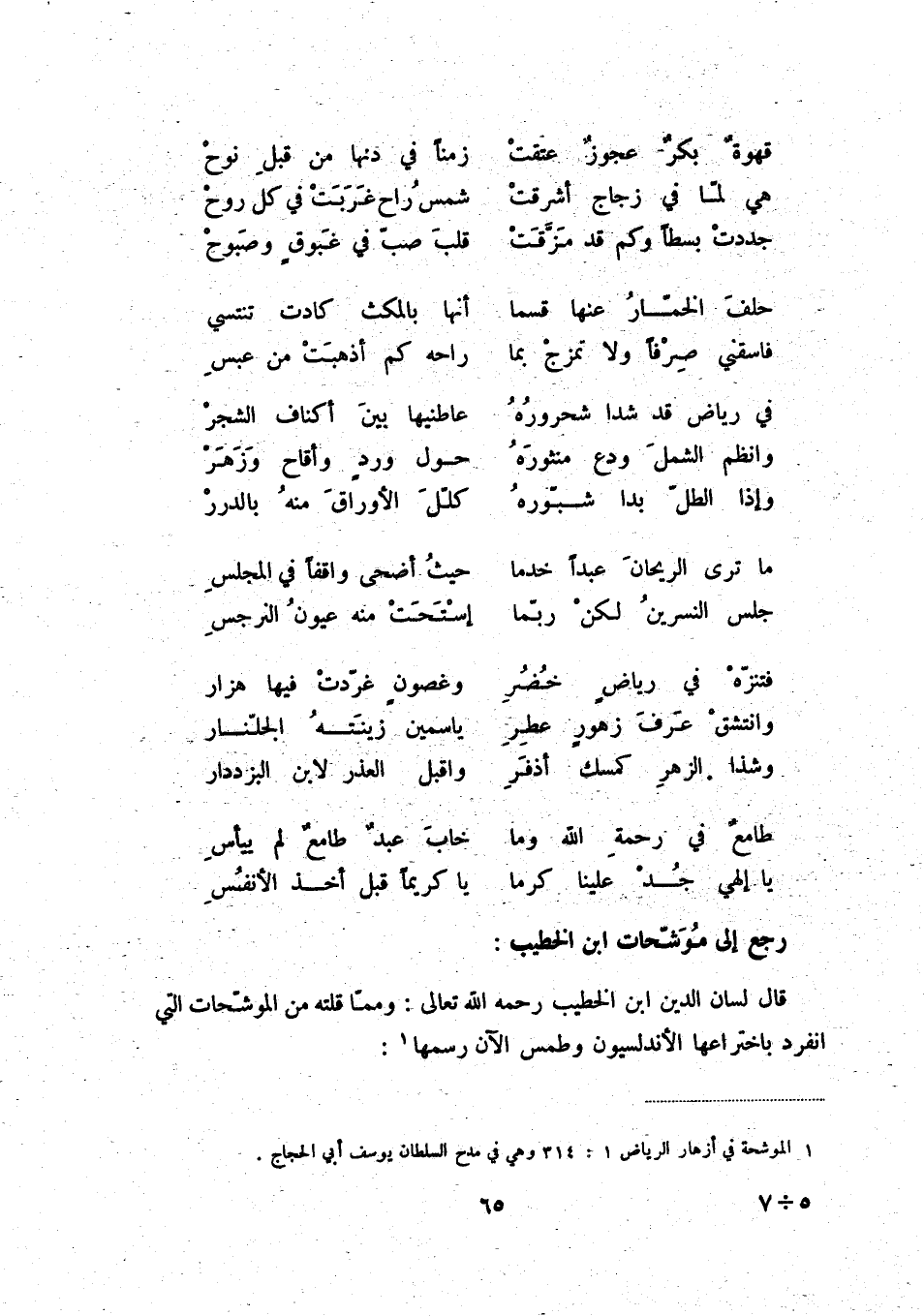 (1) الموشحة في أزهار الرياض 1: 314 وهي في مدح السلطان يوسف أبي الحجاج.
