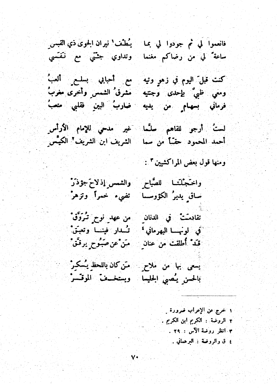 أحمد المحمود حقّاً من سما ... الشريف ابن الشريف (2) الكيّس ومنها قول بعض المراكشيين (3) :