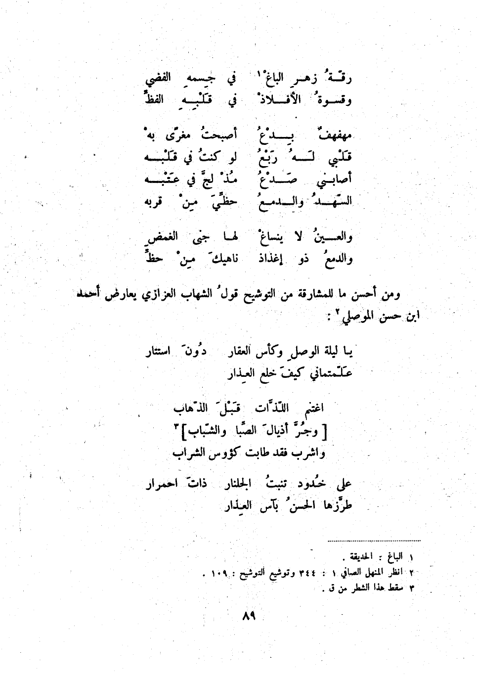 والدمع ذو إغذاذ ... ناهيك من حظّ ومن أحسن ما للمشارقة من التوشيح قول الشهاب العزازي يعارض أحمد ابن حسن الموصلي (2) :