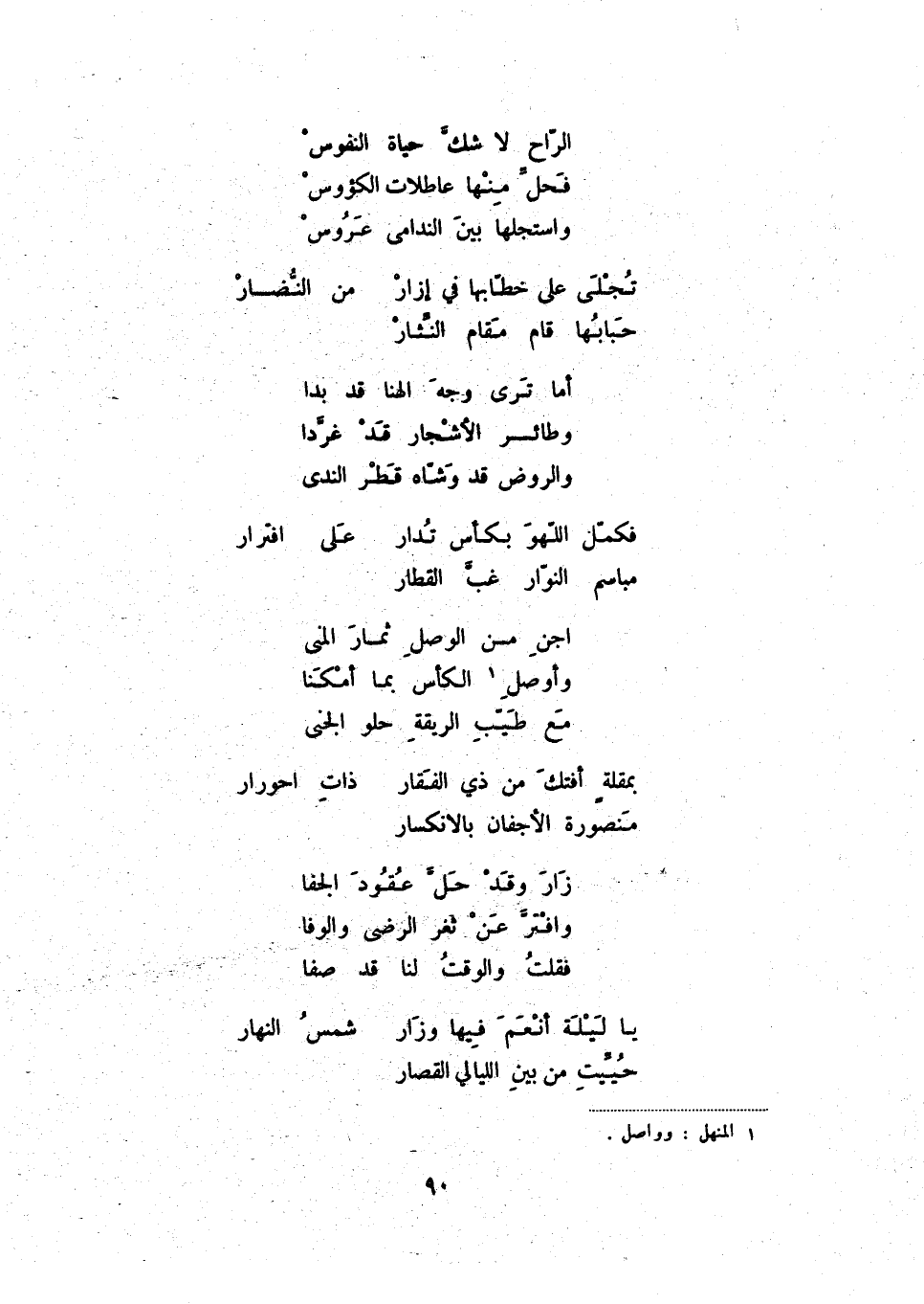 فكمّل اللهو بكأس تدار ... على افترار مباسم النوّار غبّ القطار ... اجن من الوصل ثمار المنى ... وأوصل (1) الكأس بما أمكنا ... مع طيّب الريقة حلو الجنى ...