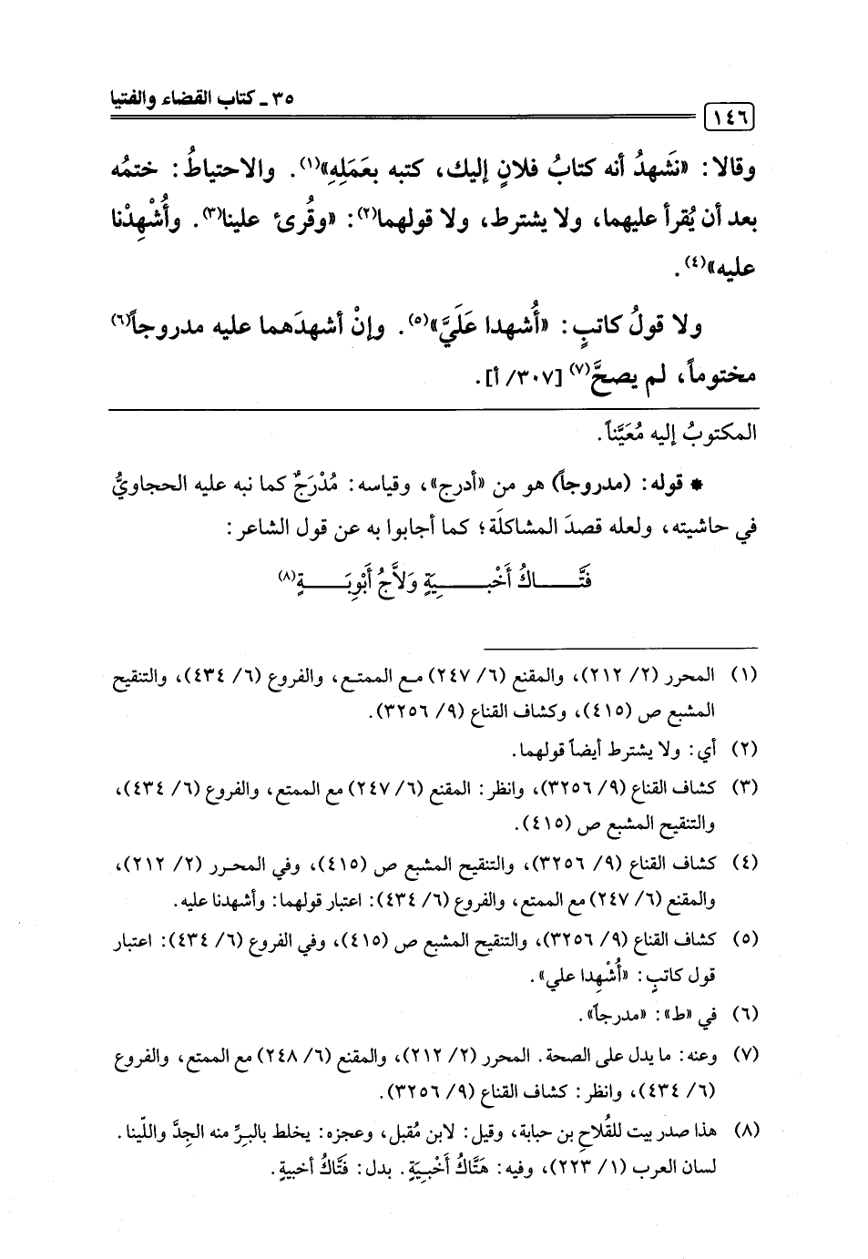 (¬4) كشاف القناع (9/ 3256)، والتنقيح المشبع ص (415)، وفي المحرر (2/ 212)، والمقنع (6/ 247) مع الممتع، والفروع (6/ 434): اعتبار قولهما: وأشهدنا عليه.