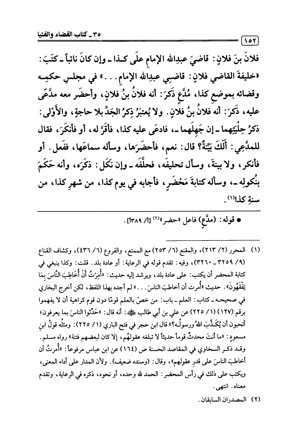 (¬1) المحرر (2/ 213)، والمقنع (6/ 253) مع الممتع، والفروع (6/ 436)، وكشاف القناع (9/ 3259 - 3260)، وفيه: تقدم قوله في الرعاية: أو عادة بلد. قلت: وكذا ينبغي في كتابة المحضر أن يكتب: على عادة بلد، ويرشد إليه حديث: "أُمِرْتُ أَنْ أُخَاطِبَ النَّاسَ بِمَا يَفْقَهُونَ". حديث "أُمرت أن أخاطبَ الناسَ. . . " لم أجده بهذا اللفظ، لكن أخرج البخاري في صحيحه -كتاب: العلم- باب: من خصّ بالعلم قومًا دون قوم كراهية أن لا يفهموا برقم (127) (1/ 225) عن علي بن أبي طالب -رضي اللَّه عنه-: أنه قال: "حَدِّثوا الناسَ بما يعرفون؛ أتحبون أن يُكَذِّبَ اللَّهُ ورسولُه؟ " قال ابن حجر في فتح الباري (1/ 225): ومثلُه قولُ ابنِ مسعودٍ: "ما أنتَ محدثٌ قومًا حديثًا لا تبلغه عقولهُم، إلا كان لبعضهم فتنة" رواه مسلم.