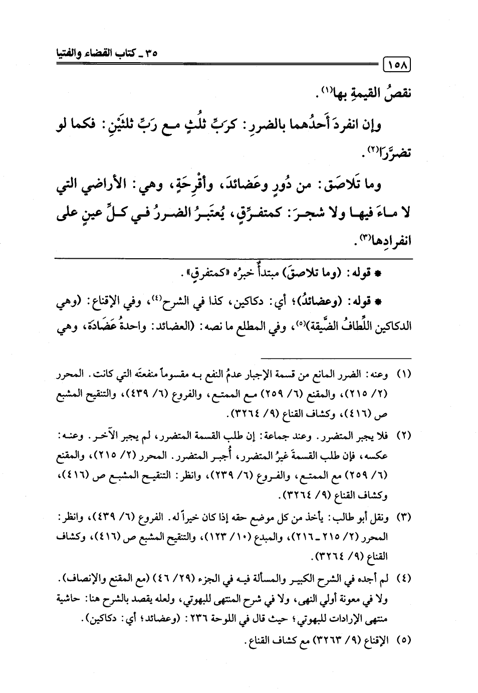 وما تَلاصَق: من دُورٍ وعَضائدَ، وأقْرِحَةٍ، وهي: الأراضي التي لا ماءَ فيها ولا شجرَ: كمتفرِّقٍ، يُعتَبرُ الضررُ في كلِّ عينٍ على انفرادِها (¬3).