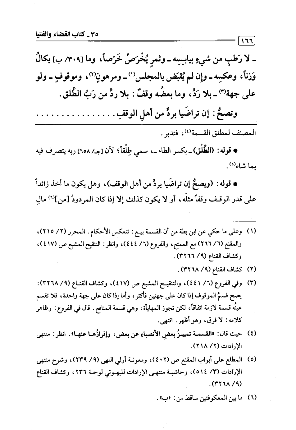 (¬3) وفي الفروع (6/ 441)، والتنقيح المشبع ص (417)، وكشاف القناع (9/ 3268): يصح قسمُ الموقوف إذا كان على جهتين فأكثر، وأما إذا كان على جهة واحدة، فلا تقسم عينُه قسمة لازمة اتفاقًا، لكن تجوز المهايأة، وهي قسمة المنافع. قال في الفروع: وظاهر كلامه؛ لا فرق، وهو أظهر. انتهى.