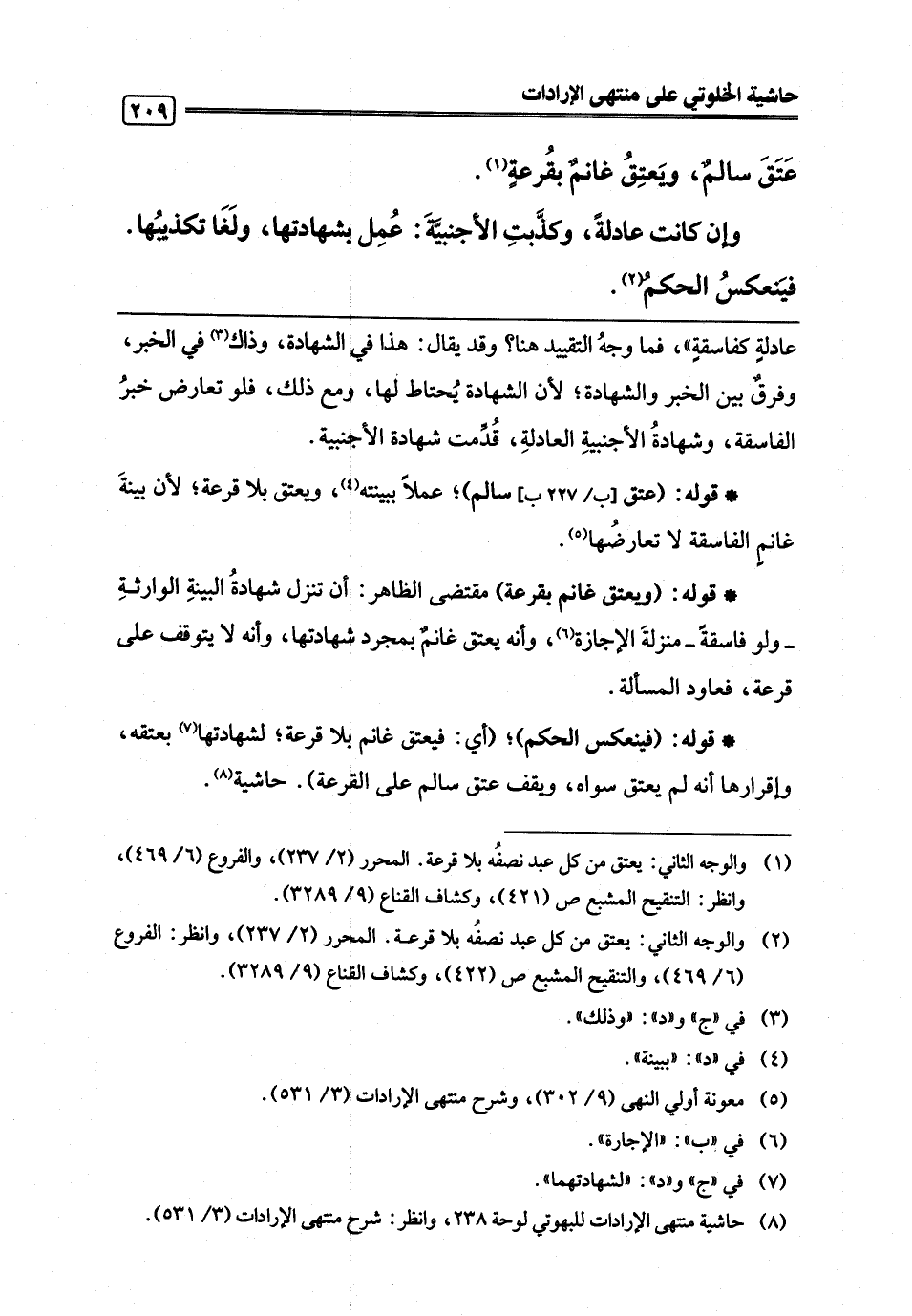 (¬8) حاشية منتهى الإرادات للبهوتي لوحة 238، وانظر: شرح منتهى الإرادات (3/ 531).