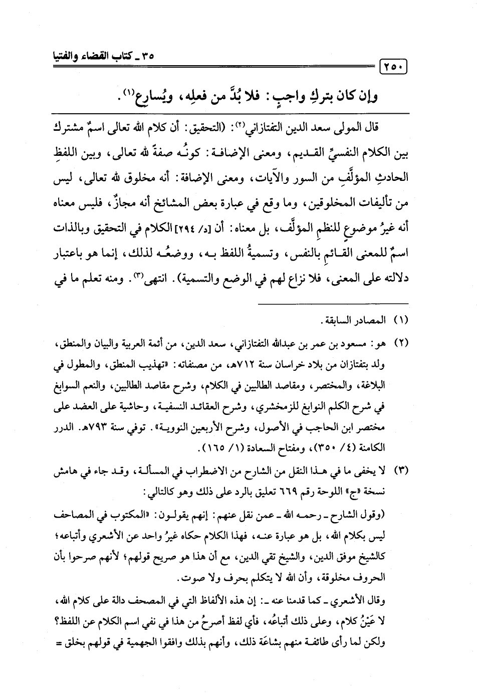 (¬2) هو: مسعود بن عمر بن عبد اللَّه التفتازاني، سعد الدين، من أئمة العربية والبيان والمنطق، ولد بتفتازان من بلاد خراسان سنة 712 هـ، من مصنفاته: "تهذيب المنطق، والمطول في البلاغة، والمختصر، ومقاصد الطالبين في الكلام، وشرح مقاصد الطالبين، والنعم السوابغ في شرح الكلم النوابغ للزمخشري، وشرح العقائد النسفية، وحاشية على العضد على مختصر ابن الحاجب في الأصول، وشرح الأربعين النووية". توفي سنة 793 هـ. الدرر الكامنة (4/ 350)، ومفتاح السعادة (1/ 165).