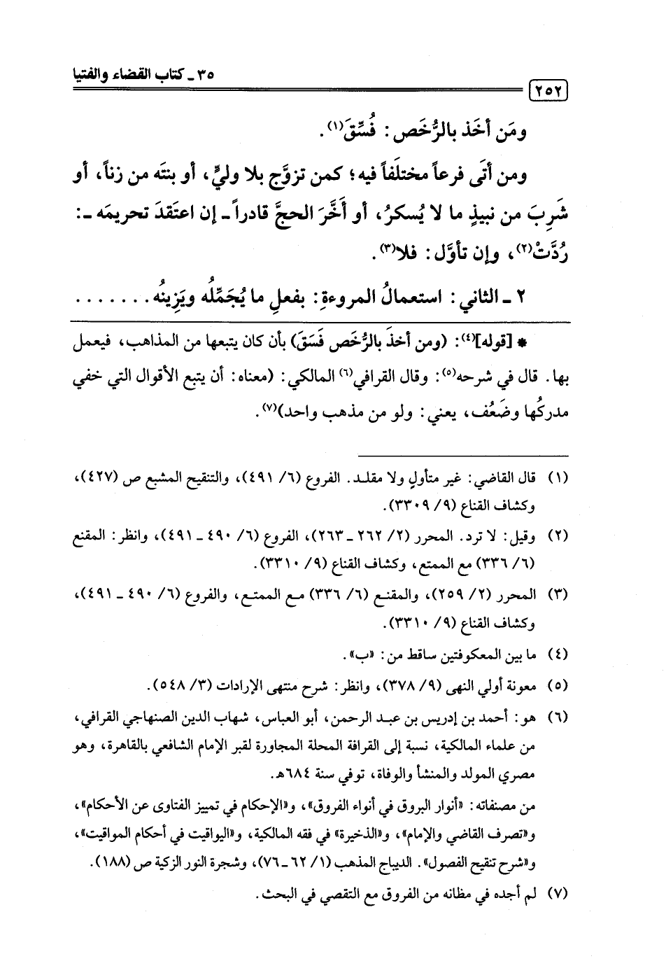 (¬6) هو: أحمد بن إدريس بن عبد الرحمن، أبو العباس، شهاب الدين الصنهاجي القرافي، من علماء المالكية، نسبة إلى القرافة المحلة المجاورة لقبر الإمام الشافعي بالقاهرة، وهو مصري المولد والمنشأ والوفاة، توفي سنة 684 هـ.