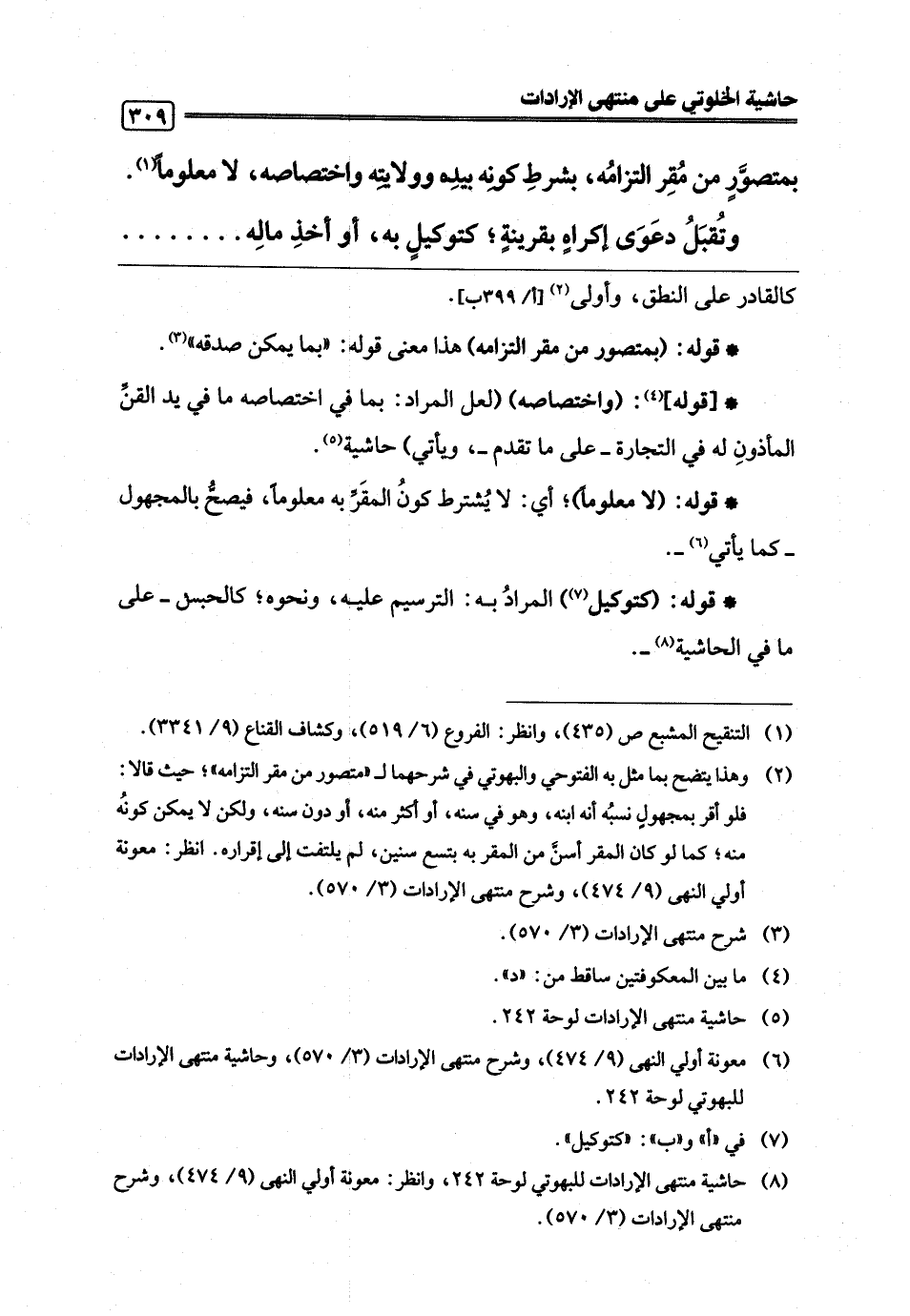 (¬8) حاشية منتهى الإرادات للبهوتي لوحة 242، وانظر: معونة أولي النهى (9/ 474)، وشرح منتهى الإرادات (3/ 570).
