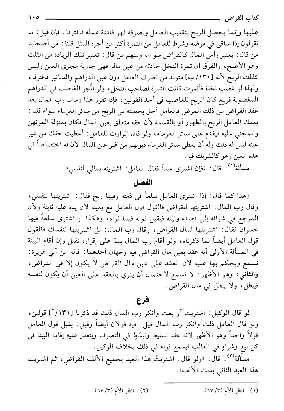 وهذا كما قال: إذا اشترى العامل سلعةً في ذمته وفيها ربح فقال: اشتريتها لنفسي، وقال رب المال: اشتريتها للقراض فالقول قول العامل مع يمينه لأن يده عليه ثابتة ولأن المرجع في شرائه إلى قصده ونيته فيقبل قوله فيما نواه، وهكذا لو اشترى سلعة فيها خسران فقال: اشتريتها لمال القراض، وقال رب المال: بل اشتريتها لنفسك فالقول قول العامل أيضاً لما ذكرناه، ولو أقام رب المال بينة على إقراره تقبل وإن أقام البينة في المسألة الأولى أنه عقد بعين مال القراض فيه وجهان أحل هما: قاله ابن أبي هريرة: تسمع ويحكم بها عليه لأن العقد على عين مال القراض لا يكون إلا في القراض، والثاني: وهو الأظهر: لا تسمع لاحتمال أن ينوي بالعقد على العين أن يكون لنفسه فيبطل، ولا يبطل في مال القراض.