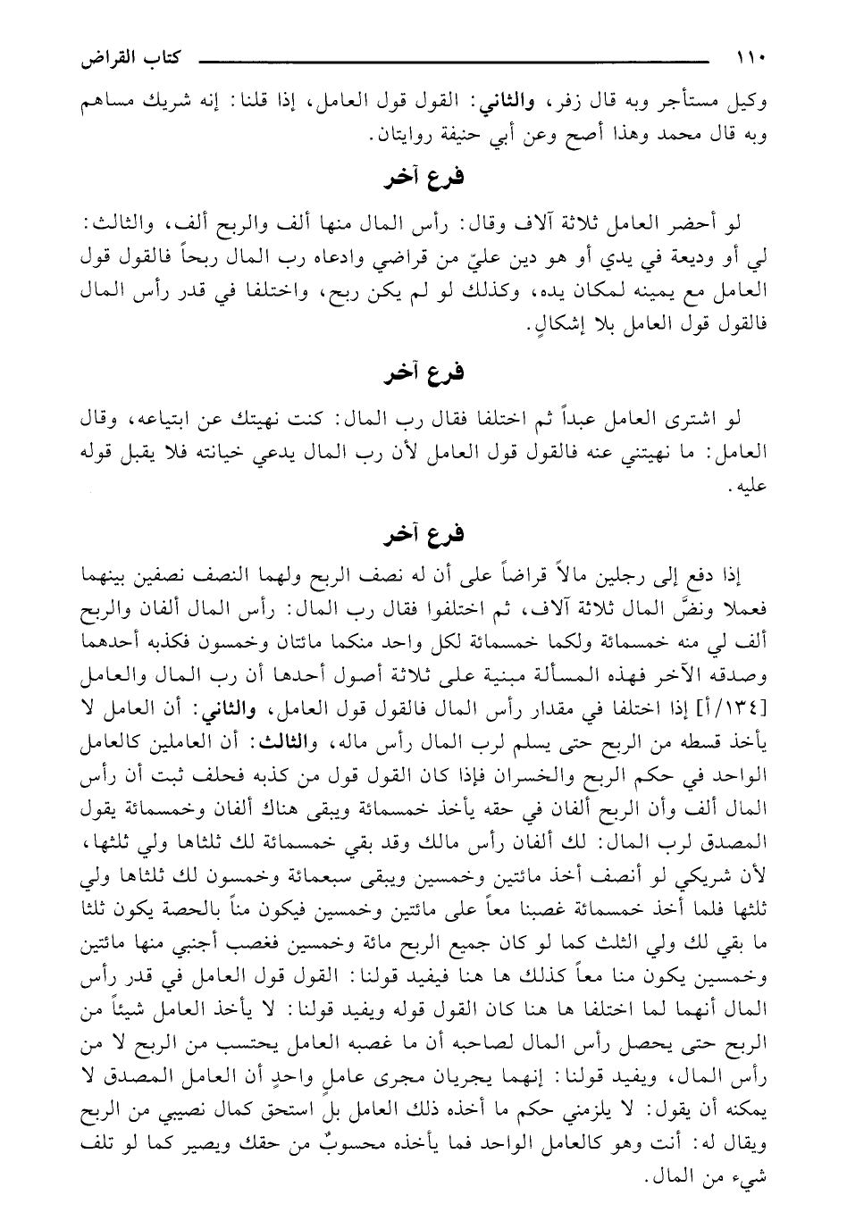 إذا دفع إلى رجلين مالاً قراضاً على أن له نصف الربح ولهما النصف نصفين بينهما فعملا ونضَّ المال ثلاثة ألاف, ثم اختلفوا فقال رب المال: رأس المال ألفان والربح ألف لي منه خمسمائة ولكما خمسمائة لكل واحد منكما مائتان وخمسون فكذبه أحدهما وصدقه الأخر فهذه المسألة مبنية على ثلاثة أصول أحدها أن رب المال والعامل [(134) / أ] إذا اختلفا في مقدار رأس المال فالقول قول العامل، والثاني: أن العامل لا يأخذ قسطه من الربح حتى يسلم لرب المال رأس ماله، والثالث: أن العاملين كالعامل الواحد في حكم الربح والخسران فإذا كان القول قول من كذبه فحلف ثبت أن رأس المال ألف وأن الربح ألفان في حقه يأخذ خمسمائة ويبقى هناك ألفان وخمسمائة يقول المصدق لرب المال: لك ألفان رأس مالك وقد بقي خمسمائة لك ثلثاها ولي ثلثها، لأن شريكي لو أنصف أخذ مائتين وخمسين ويبقى سبعمائة وخمسون لك ثلثاها ولي ثلثها فلما أخذ خمسمائة غصبنا معاً على مائتين وخمسين فيكون مناً بالحصة يكون ثلثا ما بقي لك ولي الثلث كما لو كان جميع الربح مائة وخمسين فغصب أجنبي منها مائتين وخمسين يكون منا معاً كذلك ها هنا فيفيد قولنا: القول قول العامل في قدر رأس المال أنهما لما اختلفا ها هنا كان القول قوله ويفيد قولنا: لا يأخذ العامل شيئا من الربح حتى يحصل رأس المال لصاحبه أن ما غصبه العامل يحتسب من الربح لا من رأس المال, ويفيد قولنا: إنهما يجريان مجرى عامل واحدٍ أن العامل المصدق لا يمكنه أن يقول: لا يلزمني حكم ما أخذه ذلك العامل بل استحق كمال نصيبي من الربح ويقال له: أنت وهو كالعامل الواحد فما يأخذه محسوب من حقك ويصير كما لو تلف شيء من المال.