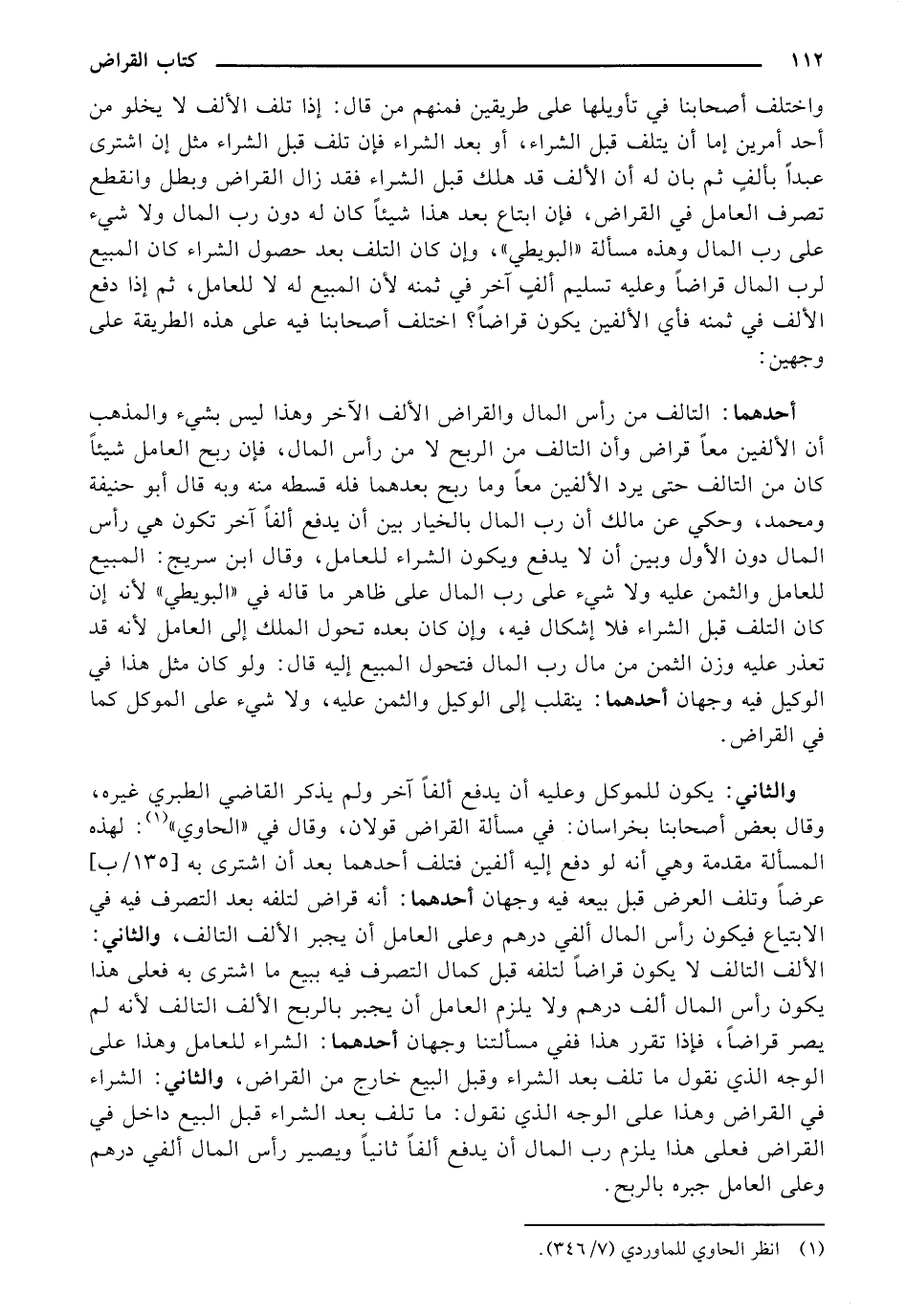 واختلف أصحابنا في تأويلها على طريقين فمنهم من قال: إذا تلف الألف لا يخلو من أحد أمرين إما أن يتلف قبل الشراء فإن تلف قبل الشراء مثل إن اشترى عبدًا بألفٍ ثم بان له أن الألف قد هلك قبل الشراء فقد زال القراض وبطل وانقطع تصرف العامل في القراض، فإن ابتاع بعد هذا شيئًا كان له دون رب المال ولا شيء على رب المال وهذه مسألة "البويطي"، وإن كان التلف بعد حصول الشراء كان المبيع لرب المال قراضًا وعليه تسليم ألفٍ آخر في ثمنه لأن المبيع له لا للعامل، ثم إذا دفع الألف في ثمنه فأي الألفين يكون قراضاً؟ اختلف أصحابنا فيه على هذه الطريقة على وجهين: