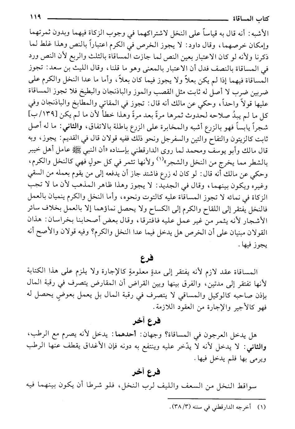 الأشبه: أنه قال به قياسًا على النخل لاشتراكهما في وجوب الزكاة فيهما وبدون ثمرتهما وإمكان خرصهما، وقال داود: لا يجوز الخرص في الكرم اعتبارًا بالنص وهذا غلط لما ذكرنا ولأنه لو كان الاعتبار بعين النص لما جازت المساقاة بالثلث والربع لأن النص ورد في المساقاة بالنصف فدل أن الاعتبار بالمعنى وهو ما قلنا، وقال الليث بن سعد: تجوز المساقاة فيهما إذا لم يكن بعلًا ولا يجوز فيما كان بعلًا، وأما ما عدا النخل والكرم على ضربين قولًا واحدًا، وحكي عن مالك أنه قال: تجوز في المقاتي والمطابخ والباذنجان وفي كل ما لم يبدُ صلاحه لحدوث ثمرها مرةً بعد مرةً وهذا خطأ لأن ما لم يكن [139/ ب] شجرًا يابسًا فهو بالزرع أشبه والمخابرة على الزرع باطلة بالاتفاق، والثاني: ما له أصل ثابت كالزيتون والتفاح والتين والسفرجل ونحو ذلك ففيه قولان قال في القديم: يجوز، وبه قال مالك وأبو يوسف ومحمد لما روى الدارقطني بإسناده "أن النبي صلى الله عليه وسلم عامل أهل خيبر بالشطر مما يخرج من النخل والشجر" ولأنها تثمر في كل حولٍ فهي كالنخل والكرم، وحكي عن مالك أنه قال: لو كان له زرع فاشتد جاز أن يدفعه إلى من يقوم بعمله من السقي وغيره ويكون بينهما، وقال في الجديد: لا يجوز وهذا ظاهر المذهب لأن ما لا تجب الزكاة في نمائه لا تجوز المساقاة عليه كالتوت ونحوه، وأما النخل والكرم ينميان بالعمل فالنخل يفتقر إلى اللقاح والكرم إلى الكساح ولا يحصل نماؤهما إلا بالعمل بخلاف سائر الأشجار لأنه يثمر من غير عمل عليه فافترقا، وقال بعض أصحابنا بخراسان: هذان القولان مبنيان على أن الخرص هل يدخل فيما عدا النخل والكرم؟ وفيه قولان والأصح أنه يجوز فيها.