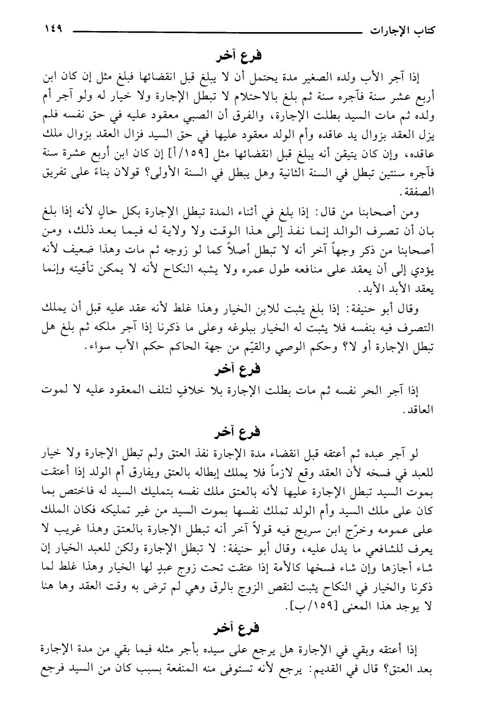 ومن أصحابنا من قال: إذا بلغ في أثناء المدةً تبطل الإجارةَ بكل حالٍ، لأنه إذا بلغ بان أن تصرف الوالد إنما نفذ إلى هذا الوقت ولا ولايةً له فيما بعد ذلك، ومن أصحابنا من ذكر وجهًا آخر أنه لا تبطل أصلًا كما لو زوجه ثم مات وهذا ضعيف لأنه يؤدي إلى أن يعقد على منافعه طول عمرهُ ولا يشبه النكاح لأنه لا يمكن تأقيته وإنما يعقد الأبد الأبد.