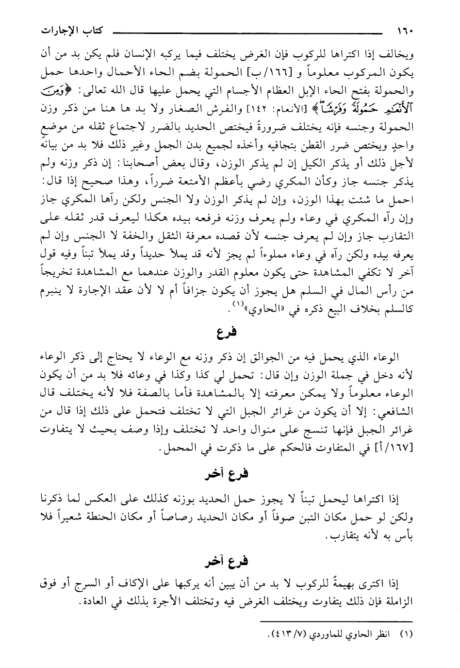 ويخالف إذا اكتراها للركوب فإن الغرض يختلف فيما يركبه الإنسان فلم يكن بد من أن يكون المركوب معلومًا و [166/ ب] الحُمولةً بضم الحاء الأحمال وأحدها حمل والحَمولةً بفتح الحاء الإبل العظام الأجسام الني يحمل عليها قال الله تعالى: {وَمِنَ الْأَنْعَامِ حَمُولَةً وَفَرْشًا} [الأنعام: (142)] والفرش الصغار ولا بد ها هنا من ذكر وزن الحمولةً وجنسه فإنه يختلف ضرورةً فيختص الحديد بالضرر لاجتماع ثقله من موضع واحي ويختص ضرر القطن بتجافيه وأخذه لجميع بدن الجمل وغير ذلك فلا بد س بيانه لأجل ذلك أو يذكر الكيل إن لم يذكر الوزن، وقال بعض أصحابنا: إن ذكر وزنه ولم يذكر جنسه جاز وكأن المكري رضي بأعظم الأمتعة ضررًا، وهذا صحيح إذا قال: احمل ما شئت بهذا الوزن، وإن لم يذكر الوزن ولا الجنس ولكن رآها المكري جاز وإن رآه المكري في وعاء ولم يعرف وزنه فرفعه بيده هكذا ليعرف قدر نقله على القارب جاز وإن لم يعرف جنسه لأن قصده معرفة الثقل والخفة لا الجنس وإن لم يعرفه بيده ولكن رآه في وعاء مملوءًا لم يجز لأنه قد يملأ حديدا وقد يملأ تبنًآ وفيه قول آخر لا تكفي المشاهدةً حتى يكون معلوم القدر والوزن عندهما مع المشاهدةً تخريجًا من رأس المال في السلم هل يجوز أن يكون جزافًا أم لا لأن عقد الإجارةَ لا ينبرم كالسلم بخلاف البيع ذكره في "الحاوي".