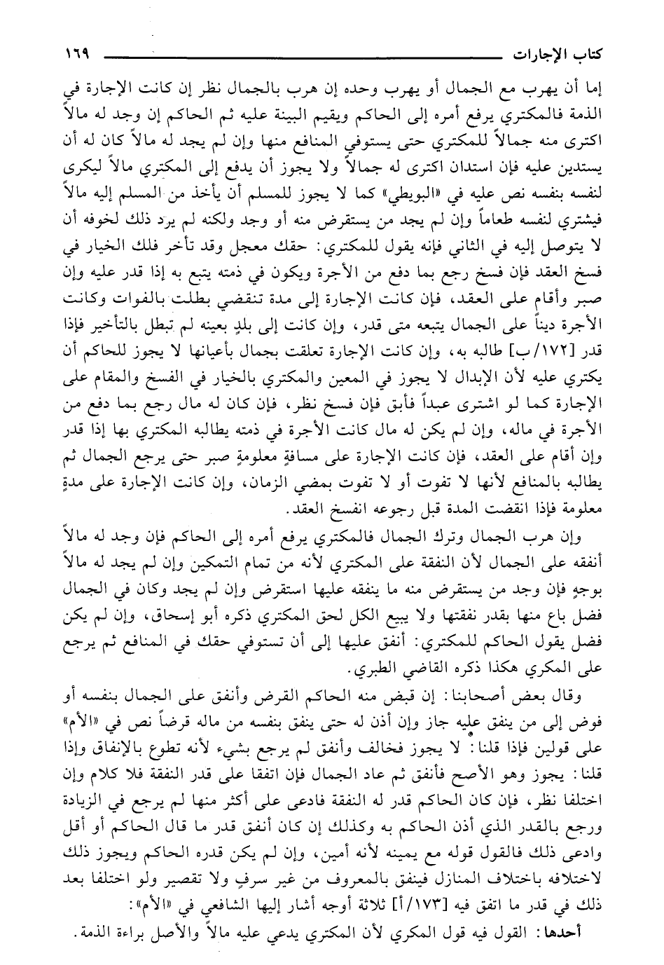 إما أن يهرب من الجمال أو يهرب وحده إن هرب بالجمال نظر إن كانت الإجارة في الذمة فالمكتري يرفع أمره إلى الحاكم ويقيم البينة عليه ثم الحاكم إن وجد له مالاً اكترى منه جمالاً للمكتري حتى يتوفي المنافع منها وإن لم يجد له مالاً كان له أن يستدين عليه فإن استدان اكترى له جمالاً ولا يجوز أن يدفع إلى المكتري مالاً ليكرى لنفسه بنفسه نص عليه في "البويطي" كما لا يجوز للمسلم إليه مالاً فيشتري لنفسه طعامًا وإن لم يجد من يستقؤض منه أو وجد ولكنه لم يرد ذلك لخوفه أن لا يتوصل إليه في الثاني فإنه يقول للمكتري: حقك معجل وقد تأخر فلك الخيار في فسخ العقد فإن فسخ رجع بما دفع من الأجرة ويكون في ذمته يتبع به إذا قدر عليه وإن صبر وأقام على العقد, فإن كانت الإجارة إلى مدة تنقضي بطلت بالفوات وكانت الأجرة دينًا على الجمال يتبعه متى قدر, وإن كانت إلى بلدٍ بعينه لم تبطل بالتأخير فإذا قدر [172/ ب] طالبه به, وإن كانت الإجارة تعلقت بجمال بأعيانها لا يجوز للحاكم أن يكتري عليه لأن الإبدال لا يجوز في المعين والمكتري بالخيار في الفسخ والمقام على الإجارة كما لو اشترى عبدًا فأبق فإن فسخ نظر, فإن كان له مال رجع بما دفع من الأجرة في ماله, وإن لم يكن له كال كانت الأجرة في ذمته يطالبه المكتري بها إذا قدر وإن أقام على العقد, فإن كانت الإجارة على مسافةٍ معلومةٍ صبر حتى يرجع الجمال ثم يطالبه بالمنافع لأنها لا تفوت أو لا تفوت بمضي الزمان, وإن كانت الإجارة على مدةٍ معلومة فإذا انقضت المدة قبل رجوعه انفسخ العقد.