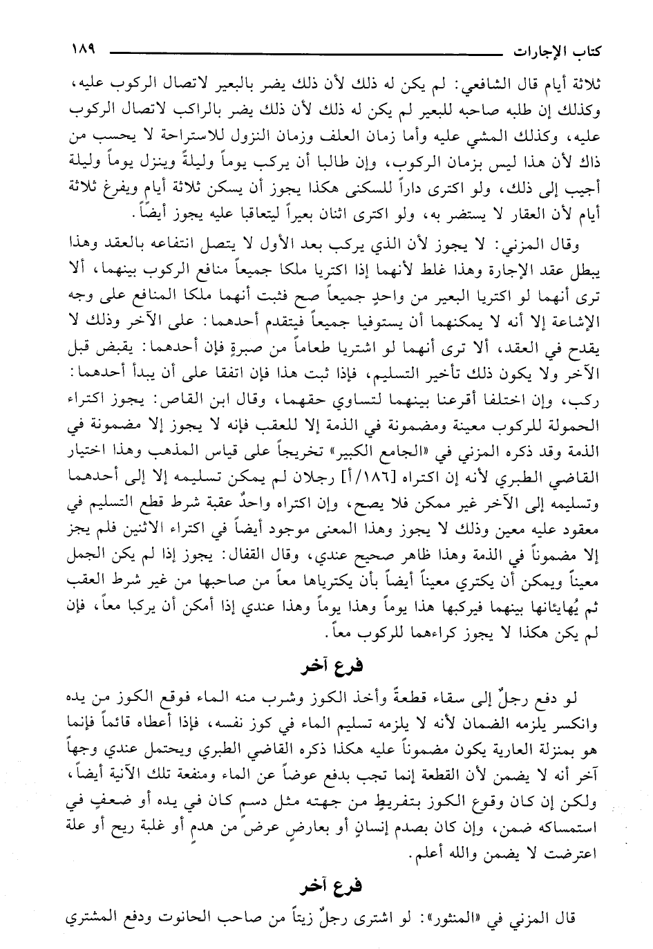 ثلاثة أيام قال الشافعي: لم يكن له ذلك يضر بالبعير لاتصال الركوب عليه, وكذلك إن طلبه صاحبه للبعير لم يكن له ذلك يضر بالراكب لاتصال الركوب عليه, وكذلك المشي عليه وأما زمان العلف وزمان النزول للاستراحة لا يحسب من ذاك لأن هذا ليس بزمان الركوب, وإن طالبا أن يركب يومًا وليلةً وينزل يومًا وليلة أجيب إلى ذلك, ولو اكترى دارًا للسكنى هكذا يجوز أن يسكن ثلاثة أيام ويفرغ ثلاثة أيام لأن العقار لا يستضر به, ولو اكترى اثنان بعيرًا ليتعاقبا عليه يجوز أيضًا.