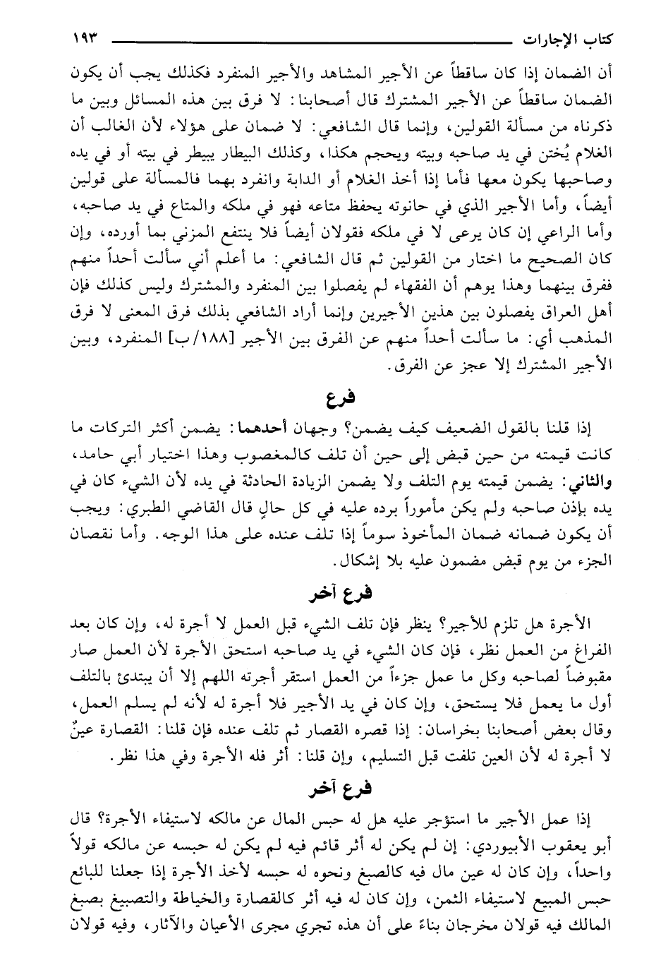 الأجرة هل تلزم للأجير؟ ينظر فإن تلف الشيء قبل العمل لا أجرة له، وإن كان بعد الفراغ من العمل نظر، فإن كان الشيء في يد صاحبة استحق الأجرة لأن العمل صار مقبوضًا لصاحبه وكل ما عمل جزءًا من العمل استقر أجرته اللهم إلا أن يبتدئ بالتلف أول ما يعمل فلا يستحق، وإن كان في يد الأجير فلا أجرة له لأنه لم يسلم العمل، وقال بعض أصحابنا بخراسان: إذا قصره القصار ثم تلف عنده فإن قلنا: القصارة عينٌ لا أجرة له لأن العين تلفت قبل التسليم، وإن قلنا: أثر فله الأجرة وفي هذا نظر.