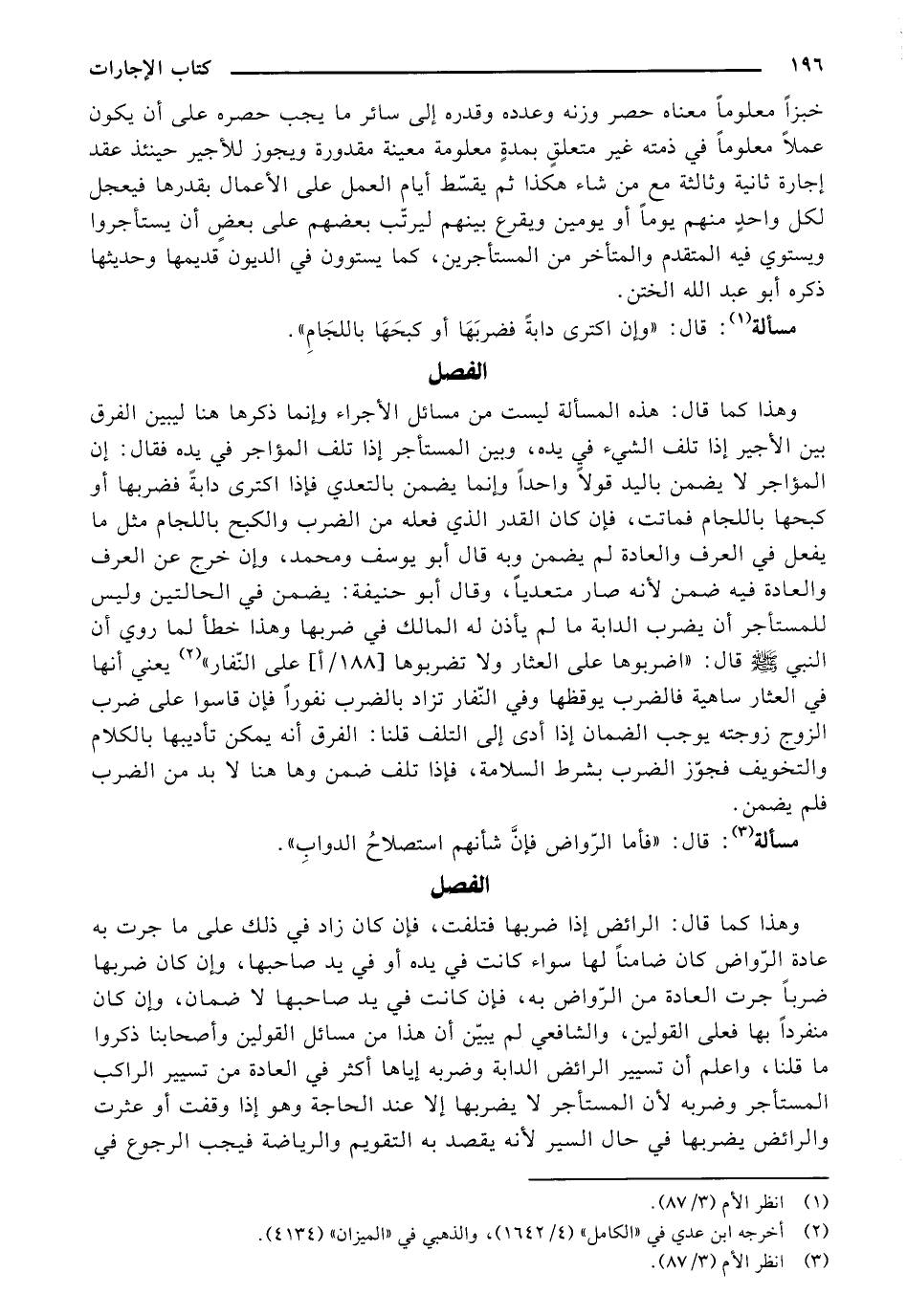 وهذا كما قال: هذه المسألة ليست من مسائل الأجراء وإنما ذكرها هنا ليبين الفرق بين الأجير إذا تلف الشيء في يده، وبين المستأجر إذا تلف المؤاجر في يده فقال: إن المؤاجر لا يضمن باليد قولًا واحدًا وإنما يضمن بالتعدي فإذا اكترى دابةً فضربها أو كبحها باللجام فماتت، فإن كان القدر الذي فعله من الضرب والكبح باللجام مثل ما يفعل في العرف والعادة لم يضمن وبه قال أبو يوسف ومحمد، وإن خرج عن العرف للمستأجر أن يضرب الدابة ما لم يأذن له المالك في ضربها وهذا خطأ لما روي أن النبي صلى الله عليه وسلم قال: "اضربوها على العثار ولا تضربوها [188/ أ] على النّفار" يعني أنها في العثار ساهية فالضرب يوقظها وفي النّفار تزاد بالضرب نفورًا فإن قاسوا على ضرب الزوج زوجته يوجب الضمان إذا أدى إلى التلف قلنا: الفرق أنه يمكن تأديبها بالكلام والتخويف فجوّز الضرب بشرط السلامة، فإذا تلف ضمن وها هنا لا بد من الضرب فلم يضمن.